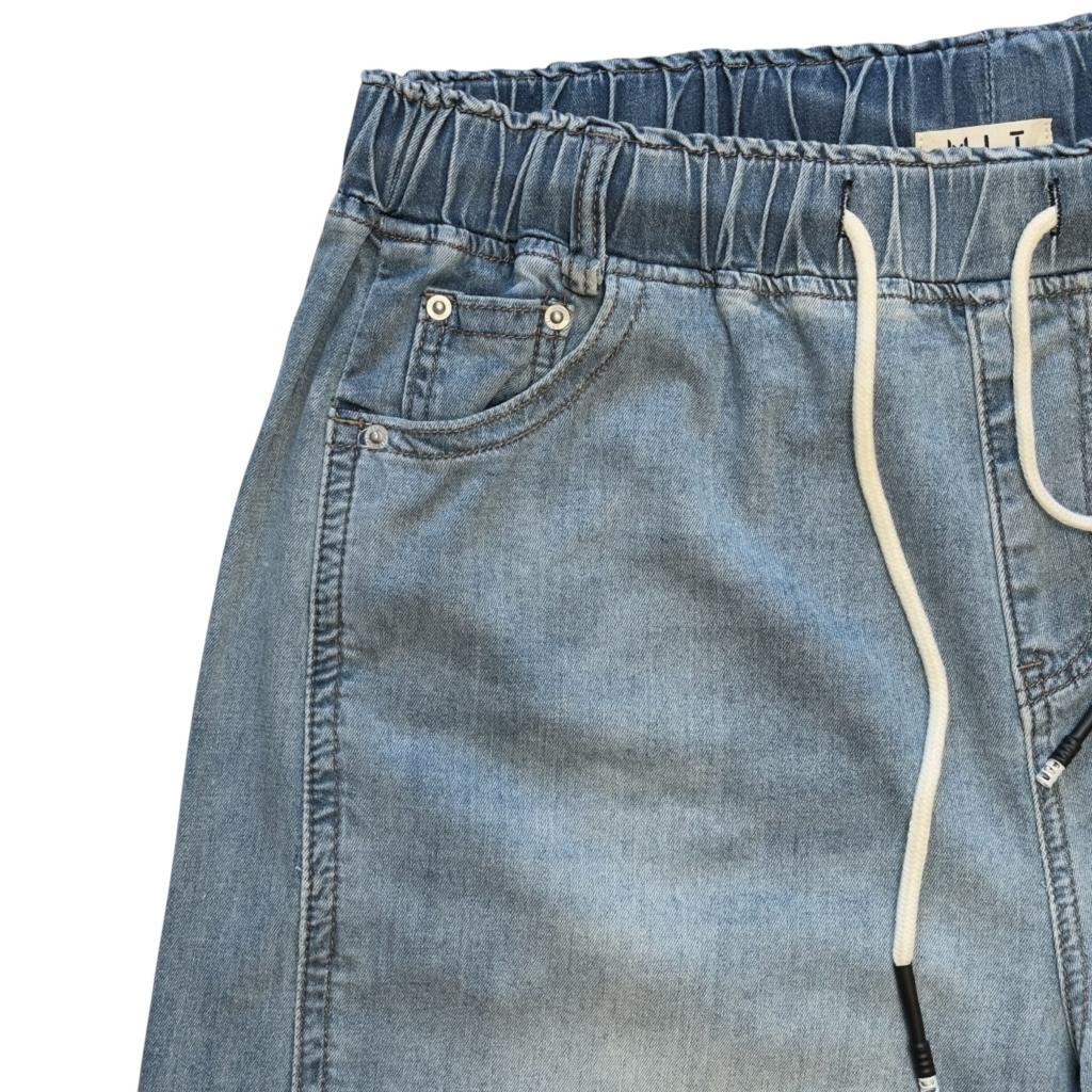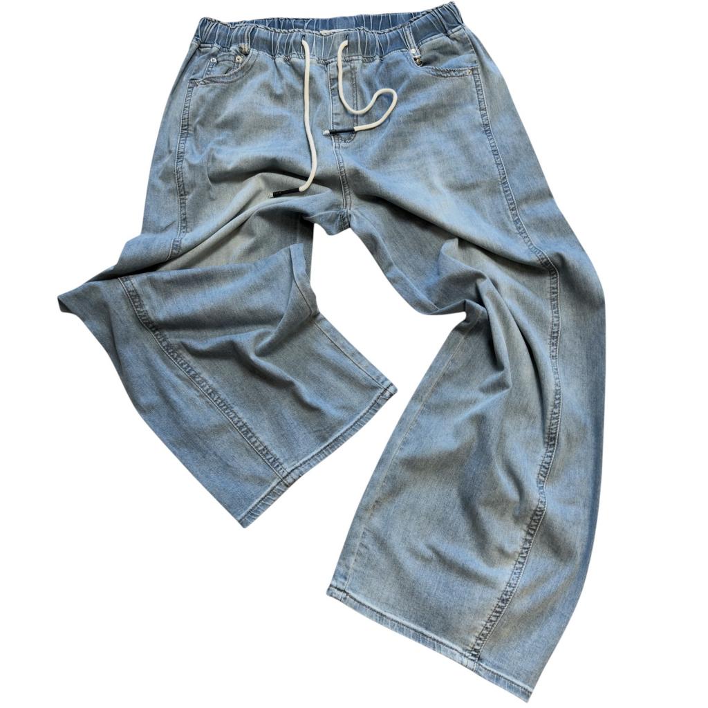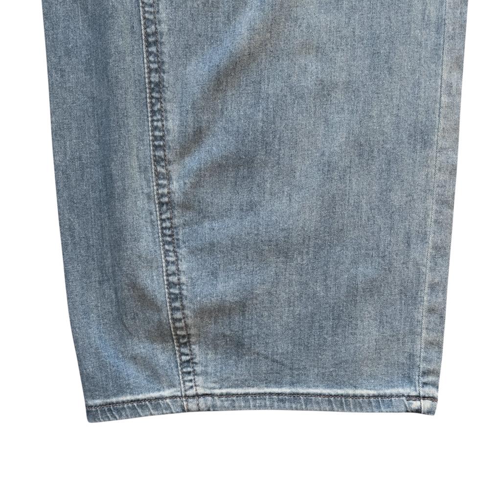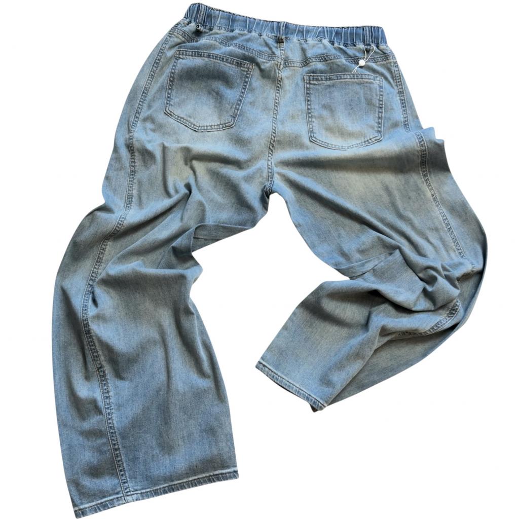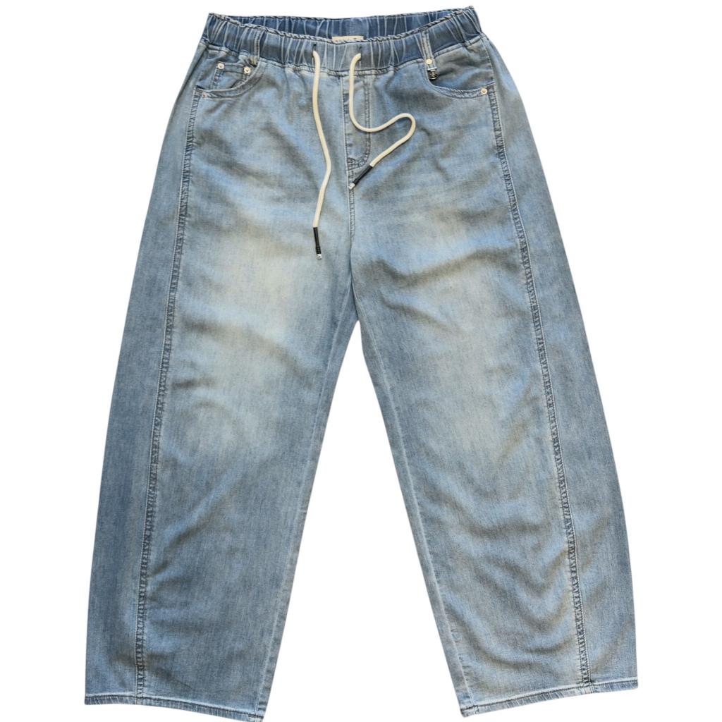 Эти широкие голубые джинсы полной длины представляют собой стильный и современный летний вариант. Пояс на круговой корсажной резинке обеспечивает комфортную посадку на талии. На поясе имеются шлевки для ремня, а имитация гульфика создает классический вид джинсов. Передние и задние карманы функциональны и украшены клепками для дополнительного эффекта. Белый оригинальный шнурок на поясе и скошенный боковой шов брючин придают джинсам очень стильный и оригинальный вид.
