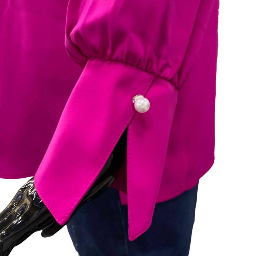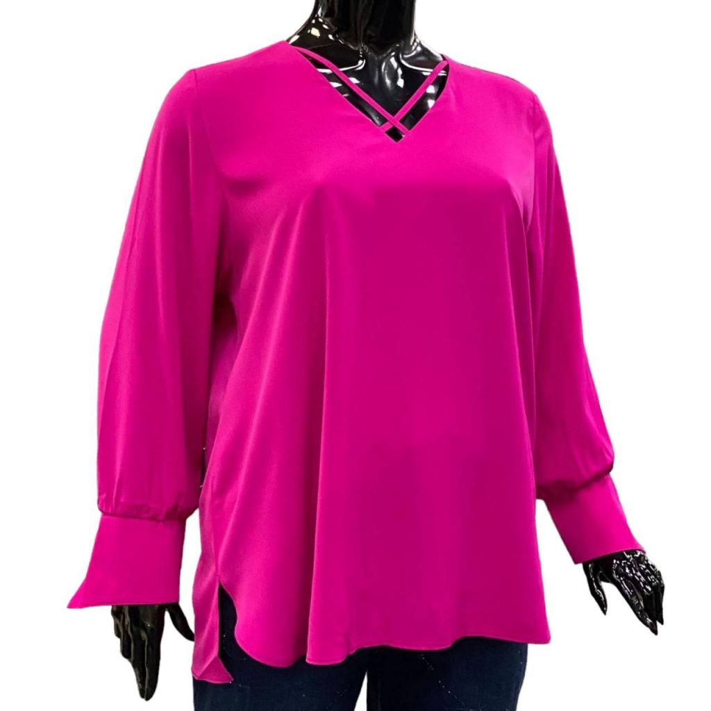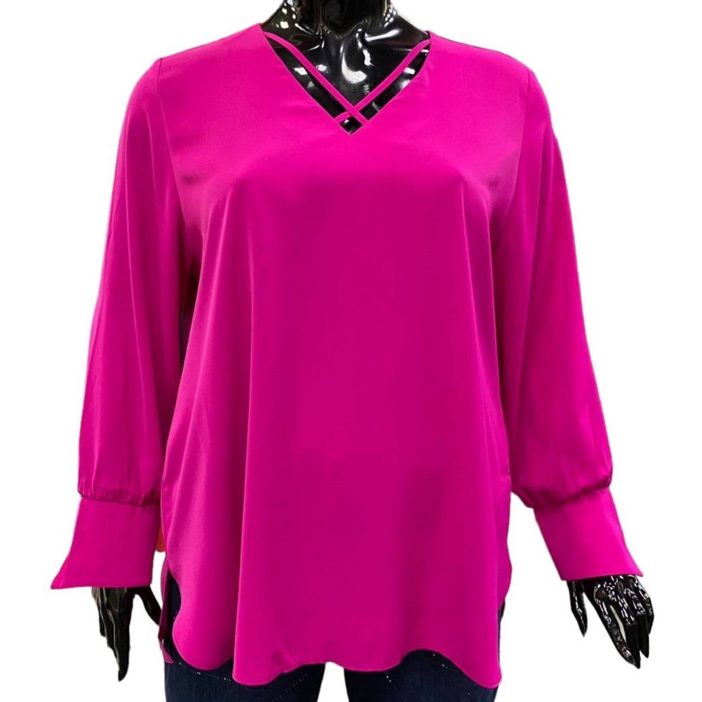 Модель прямого силуэта выполнена из ткани « Bali». Вырез горловины V- образный. Рукав втачной ‚ длинный, низ на широкой манжете. Низ полочки - фигурный, спинки — прямой.