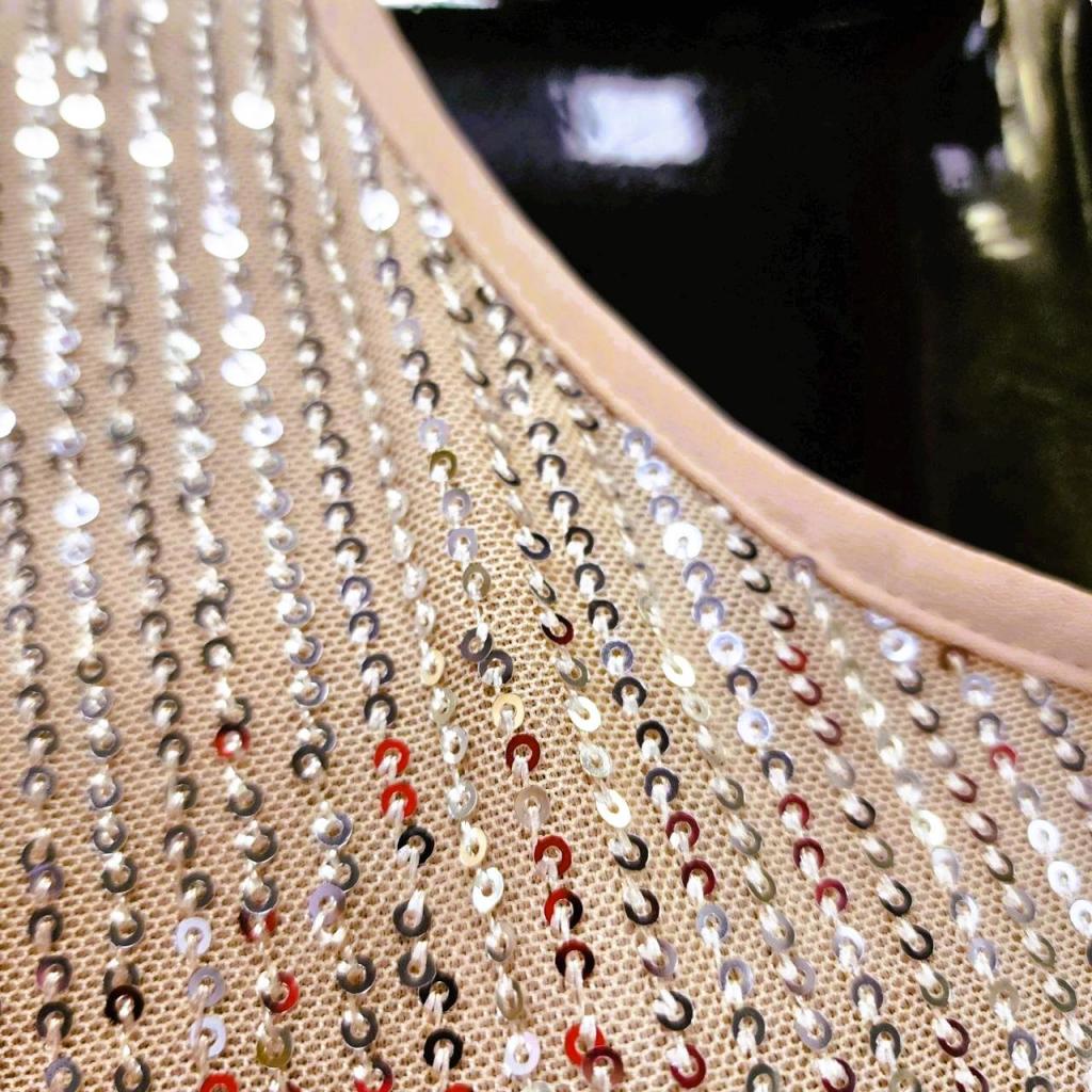 Цвет и материал: благородный бежевый оттенок с отделкой серебристыми пайетками на полочке