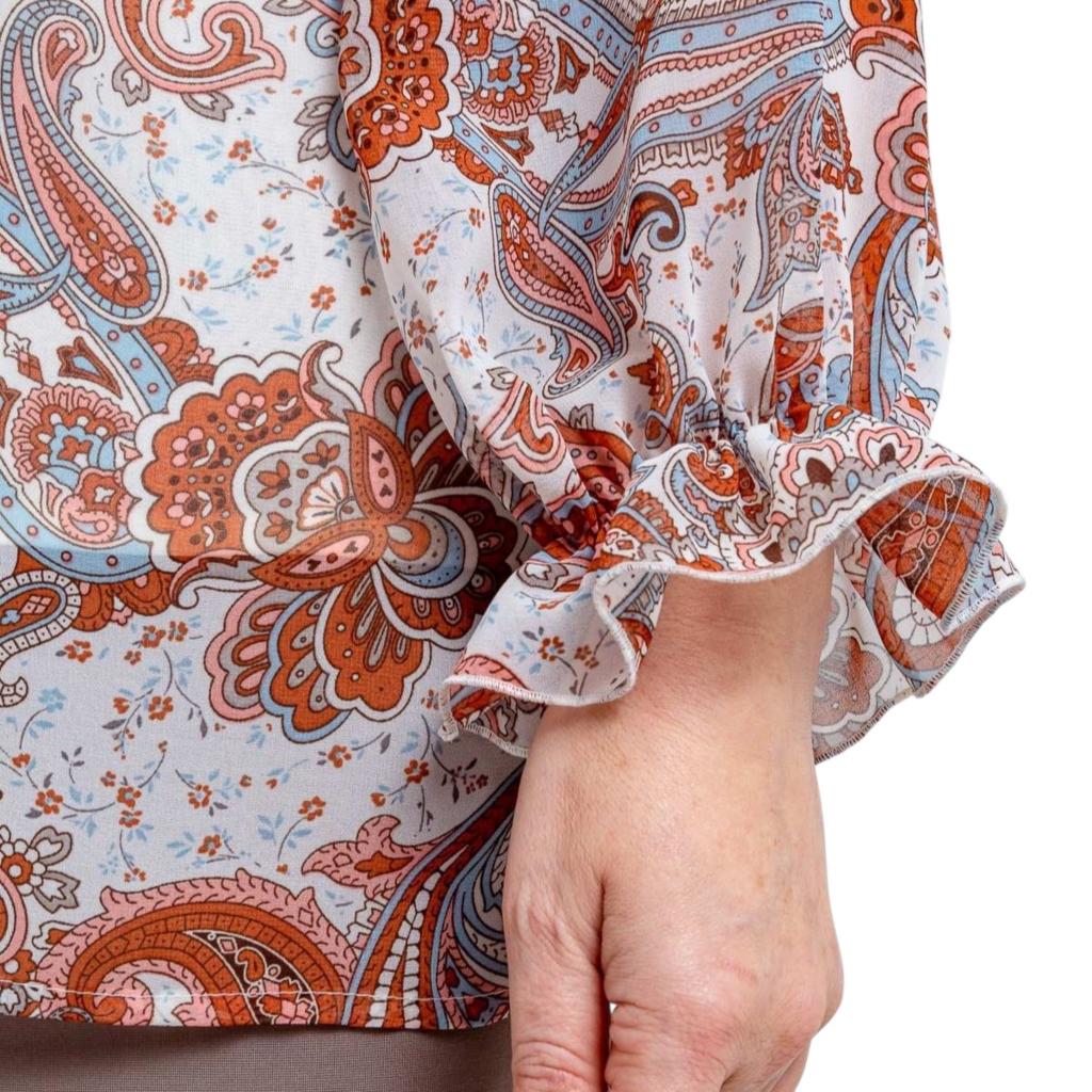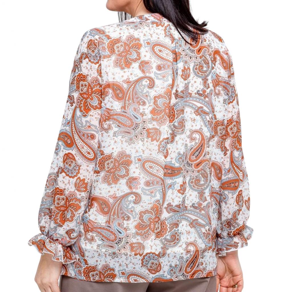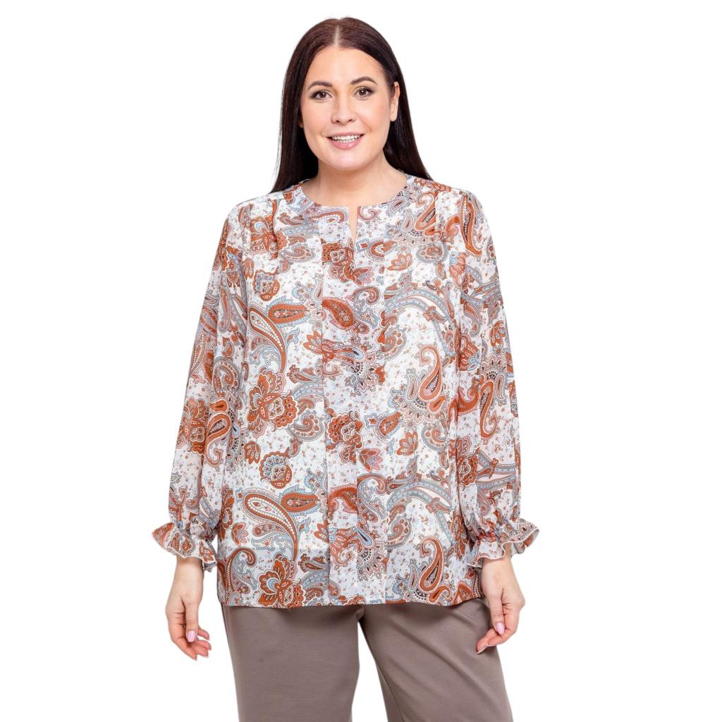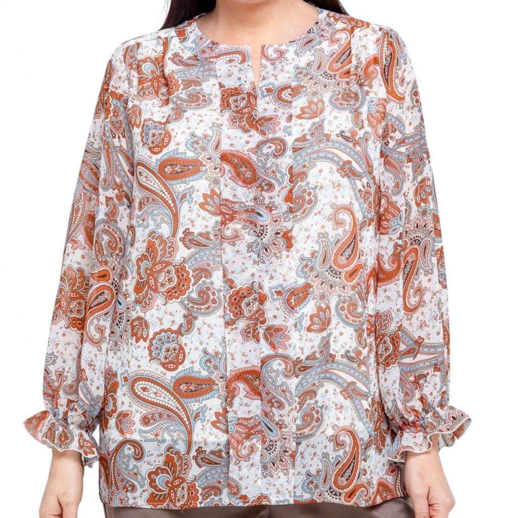 Шифоновая блузка — идеальный выбор для особых случаев. Блуза свободного силуэта на подкладке из шифона. Красивый огуречный принт теплых оттенков. Длинный рукав на манжетах с резинкой.По центру передней полочки декоративные складки, в области окетки на плечах защипы.