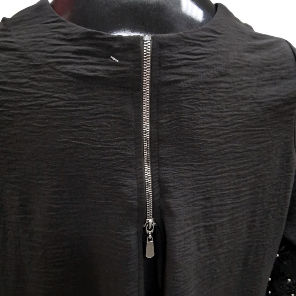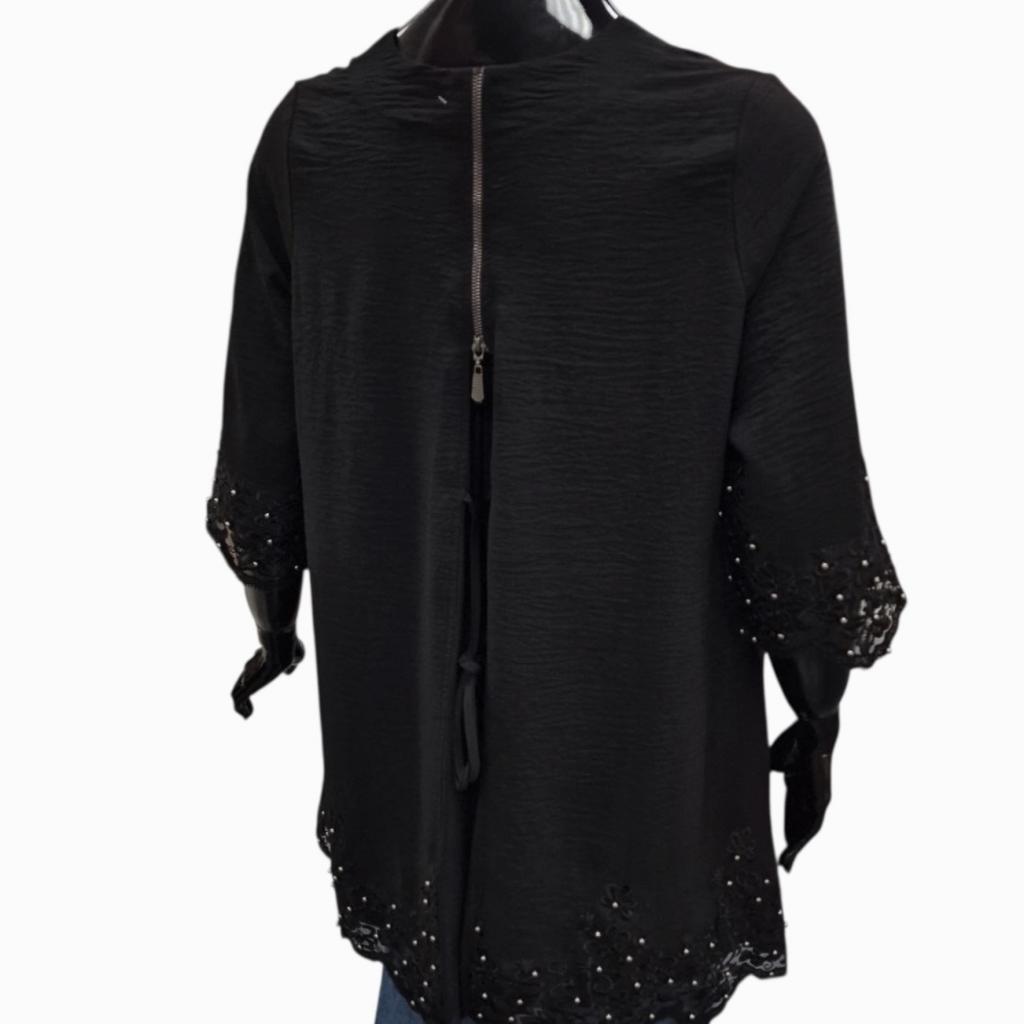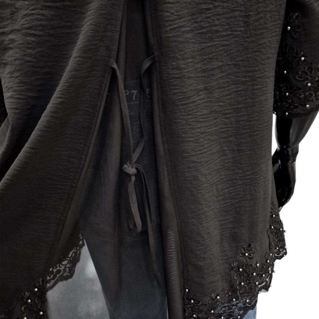Общее впечатление: туника выглядит одновременно торжественно и женственно. Кружевные детали и жемчуг привносят ноту классической элегантности, а нестандартное оформление спинки добавляет современный игривый штрих. Подходит для мероприятий, где важно выглядеть нарядно, но при этом не скованно.