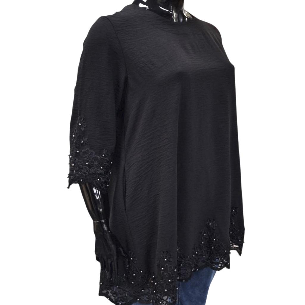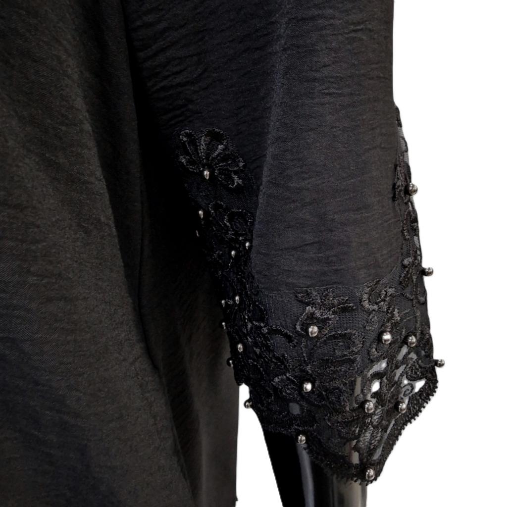Отделка низа туники и рукавов: кружево и жемчужины — создают роскошный акцент и добавляют изделию праздничности.