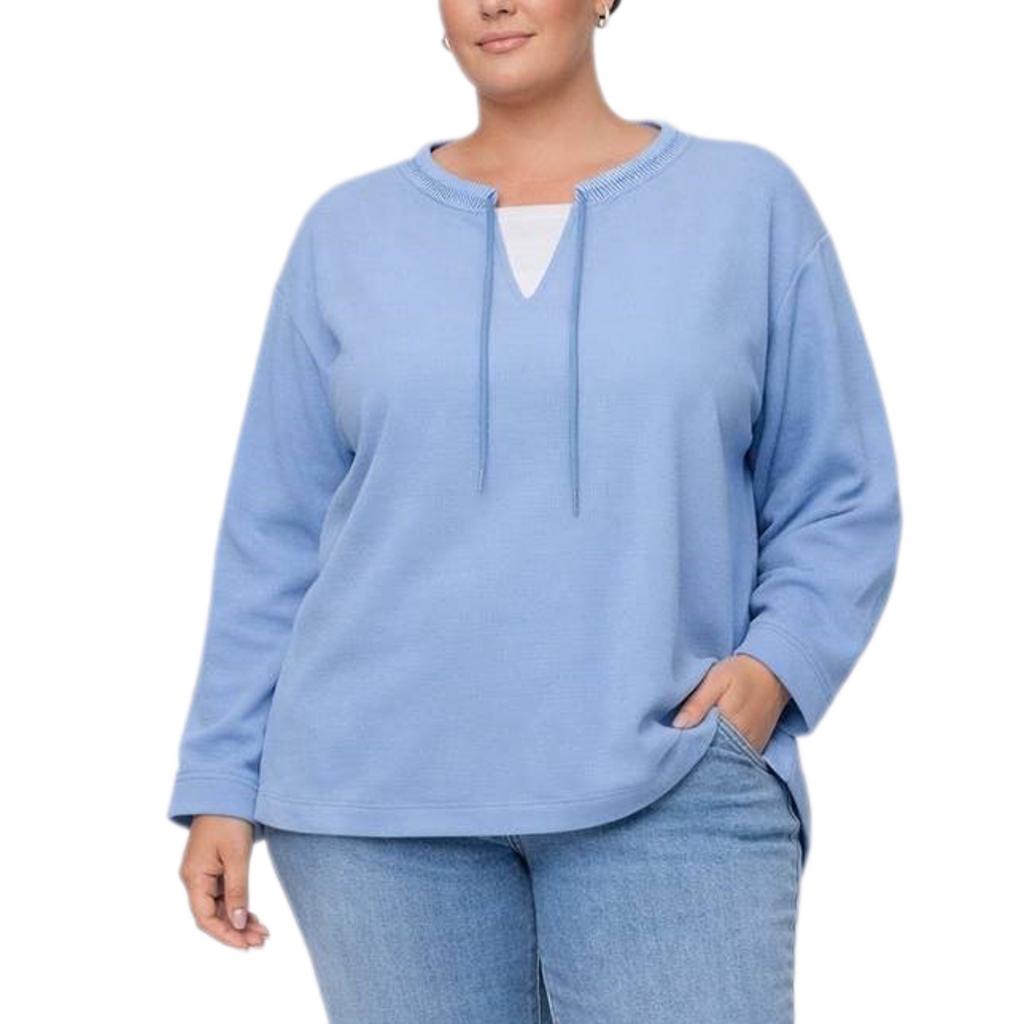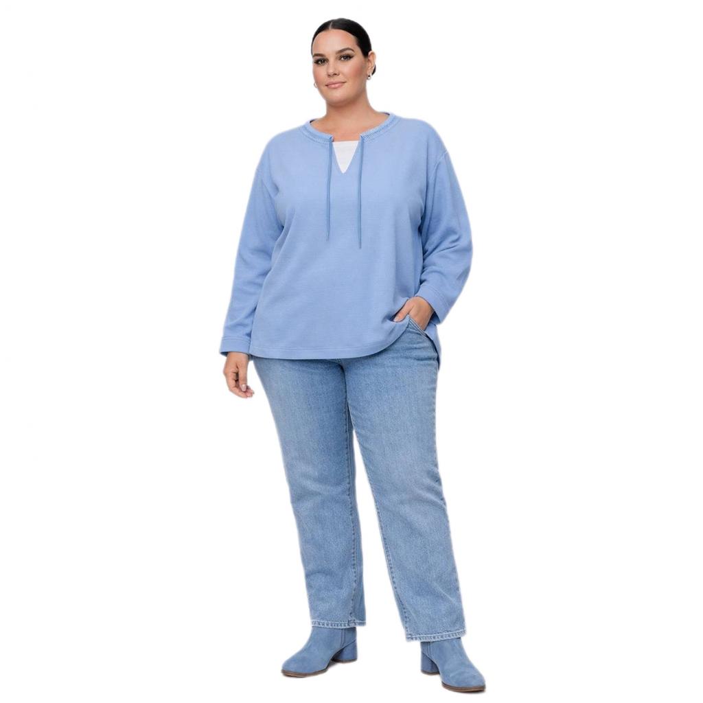 Спокойный, удобный свитшот, понятный покупателю с первой примерки. Плотный трикотаж: 97% хлопок, 3% лайкра — держит форму, приятный к телу. Крой свободный, с учётом plus size, ничего не утяжеляет и хорошо сидит.