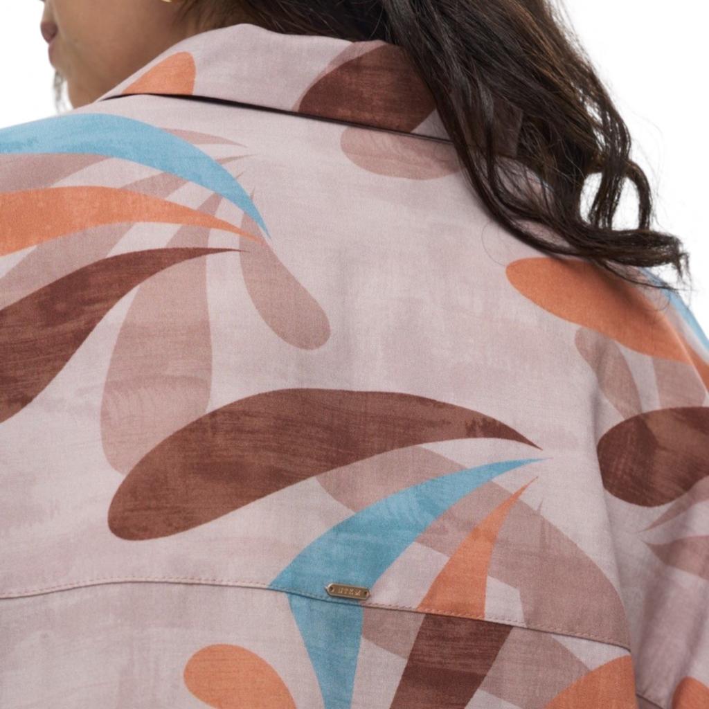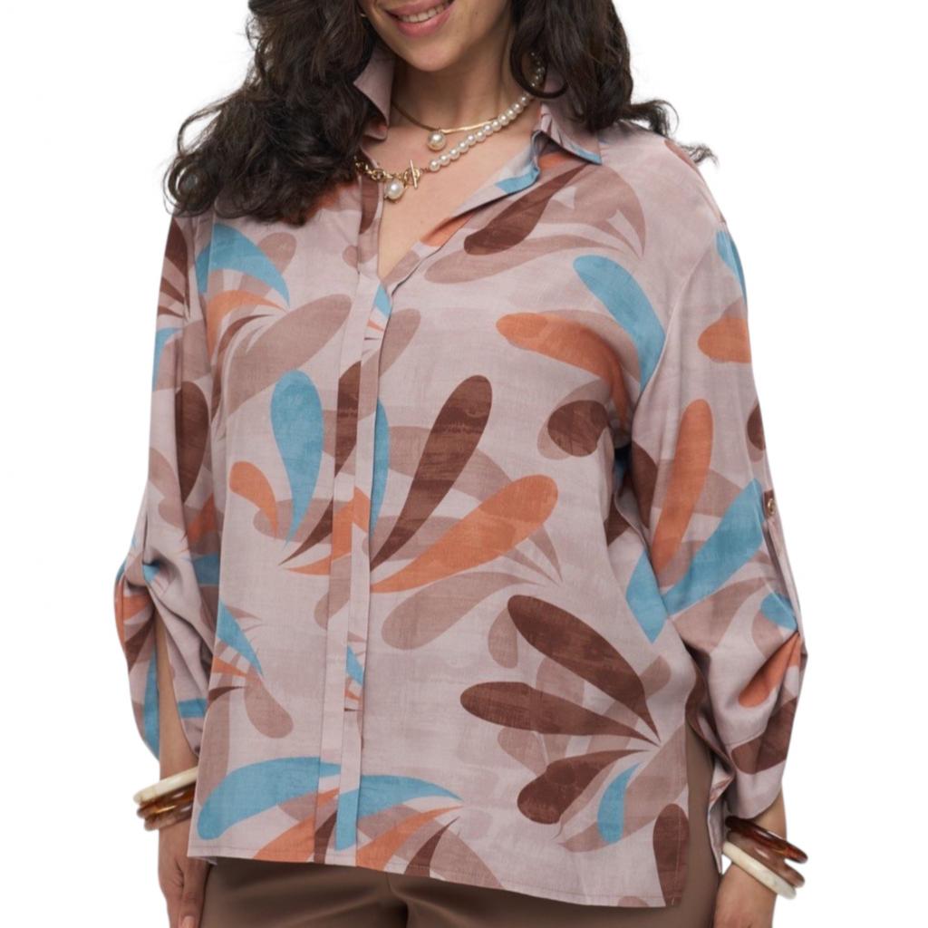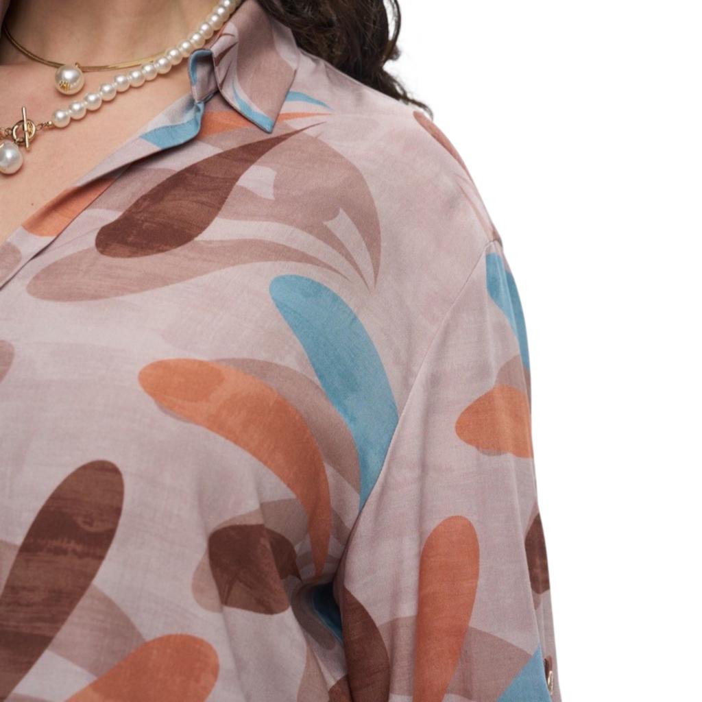 • Принт: Сложный абстрактный узор в теплой цветовой гамме с преобладанием терракотовых, бежевых и голубых оттенков придает образу художественную выразительность.