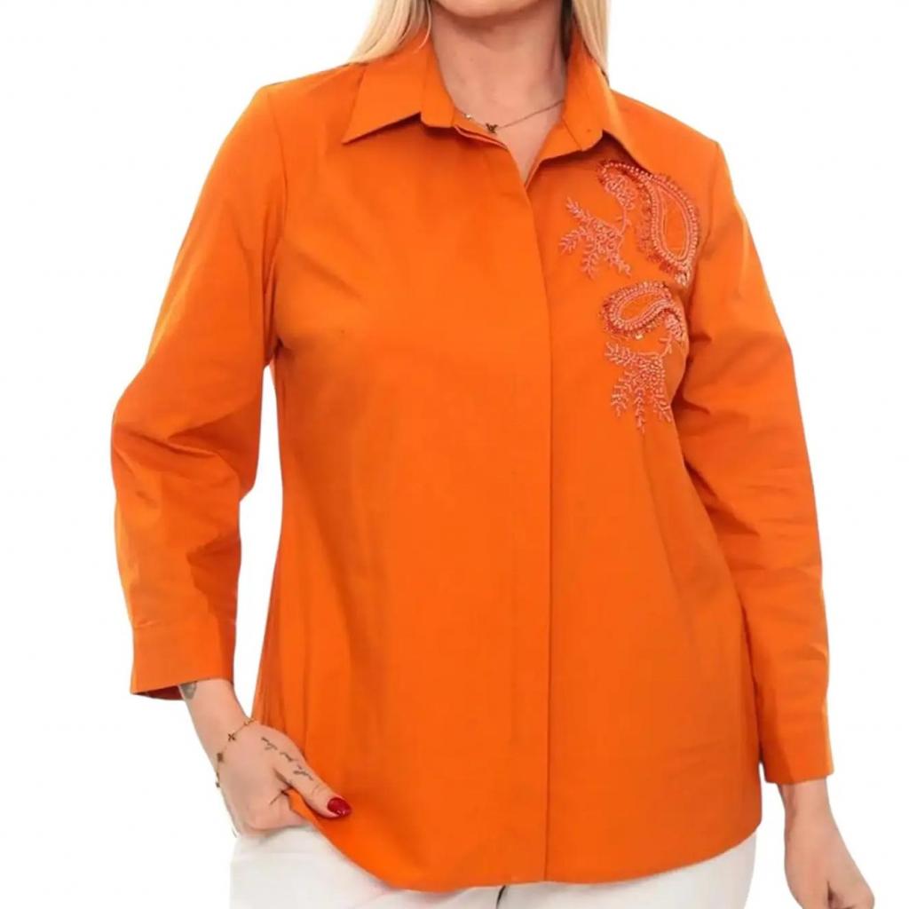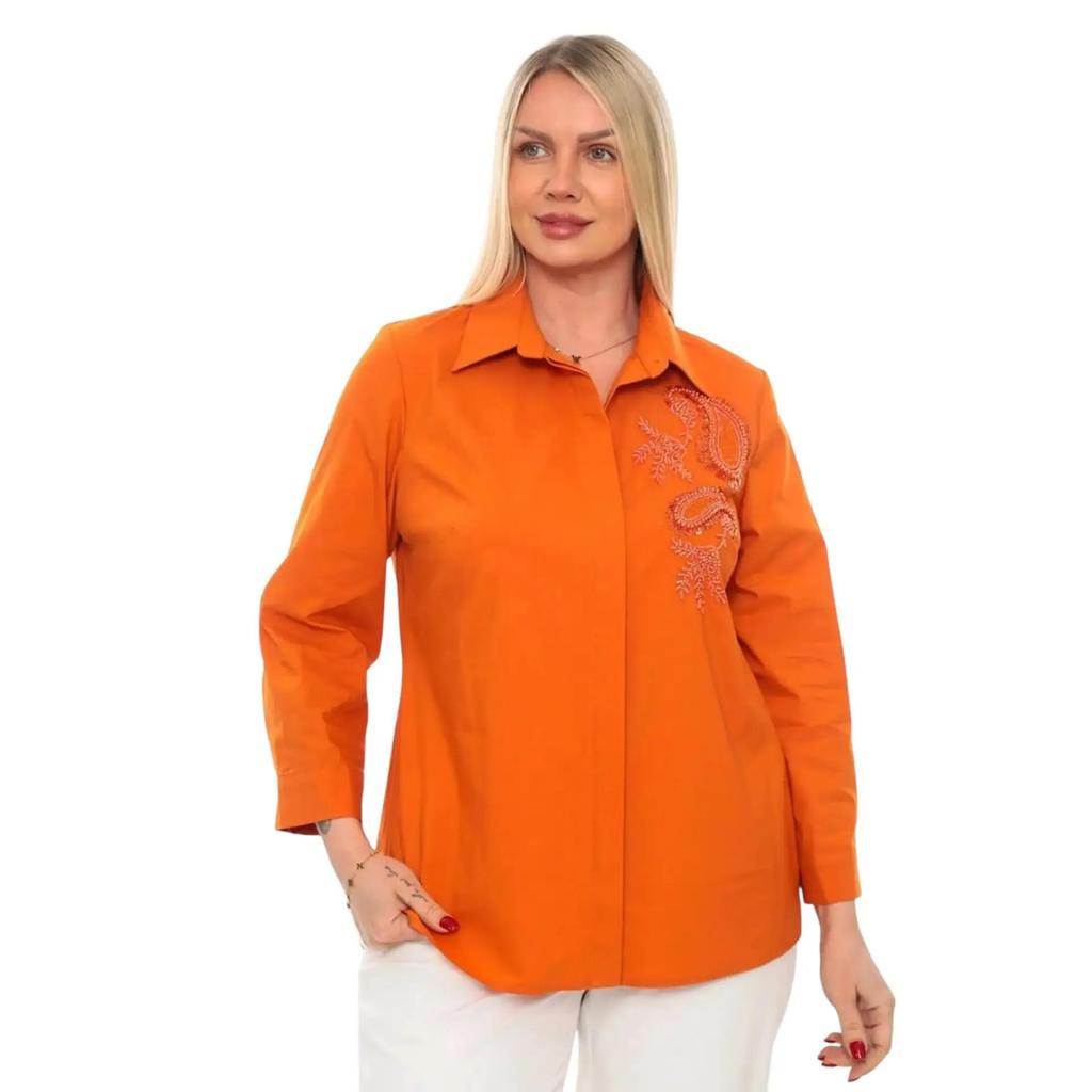Изысканная модель оранжевой рубашки, которая станет идеальным дополнением как к деловому, так и к повседневному гардеробу. Отложной воротник придает изделию утонченный классический вид, а втачной рукав полной длины с элегантной манжетой на пуговице обеспечивает комфорт. Удлиненный силуэт с длиной до сгиба бедра позволяет носить рубашку как самостоятельный элемент или комбинировать с брюками и юбками. Боковые разрезы добавляют модели динамики и обеспечивают удобство при ходьбе. Особую изюминку изделию придают оригинальные выточки на груди и орнамент из бисера, бусинок и пайеток, которые создают изящный силуэт и подчеркивают женственность образа. Рубашка станет незаменимой базой для создания романтичных образов, позволяя экспериментировать с разными стилями и аксессуарами.