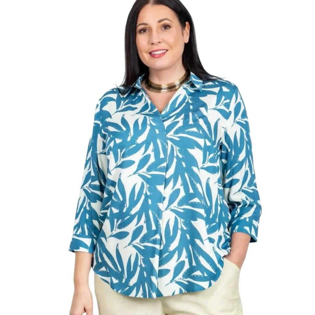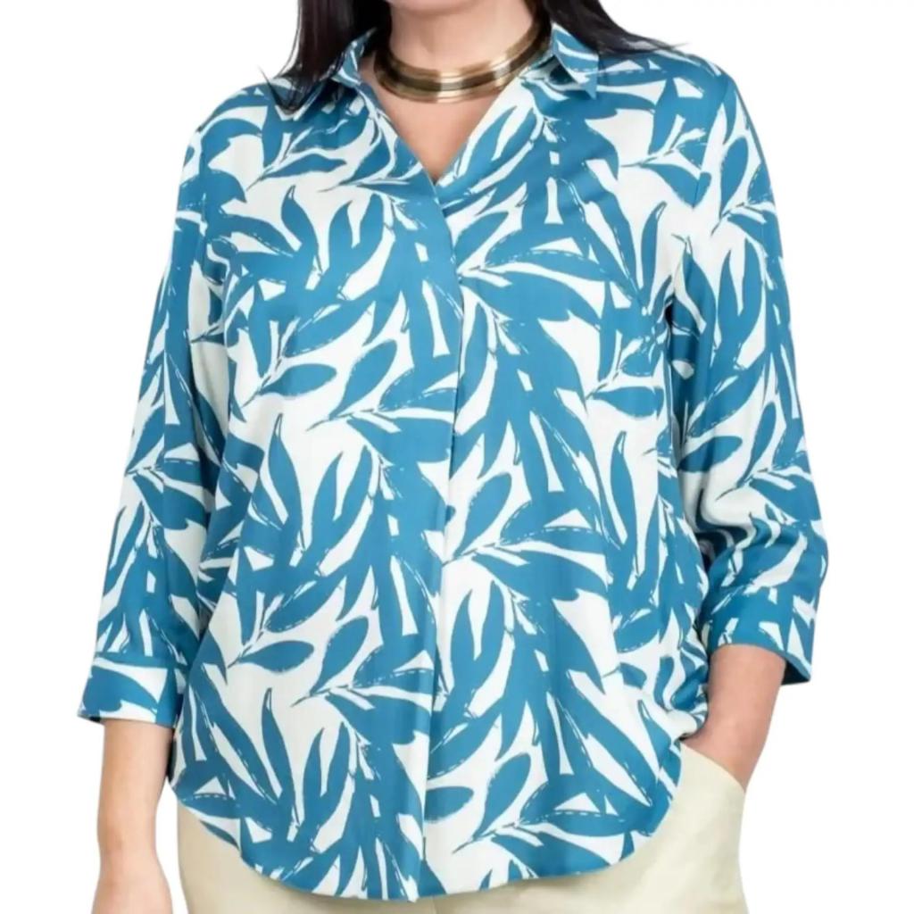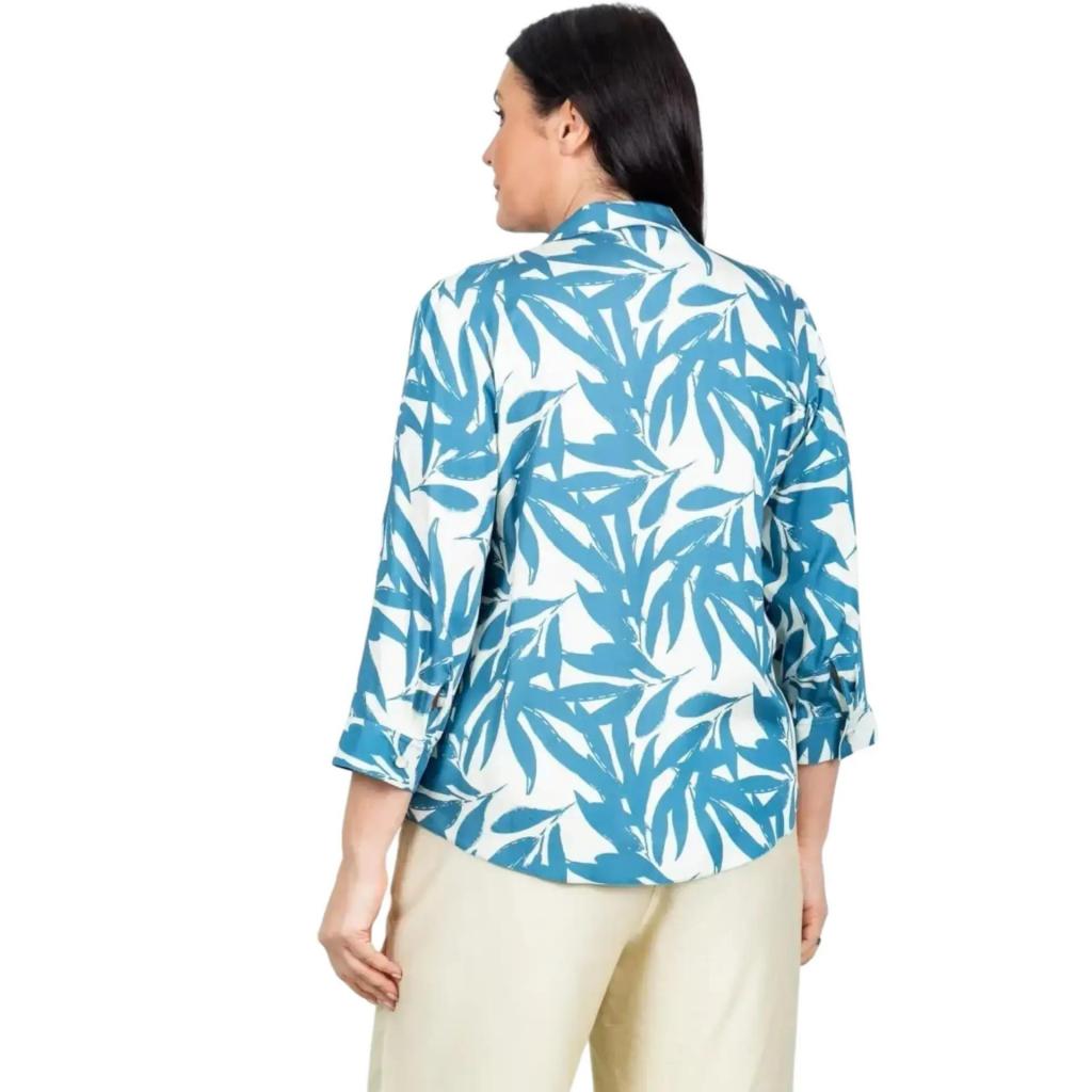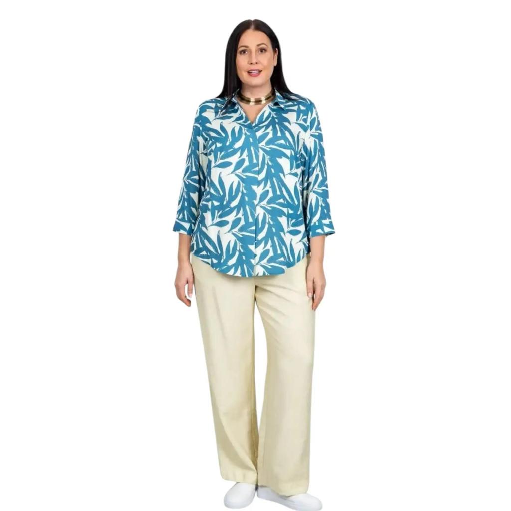 Дизайн привлекает внимание стильным принтом: на белом фоне раскинулись изящные голубые листья растений. Такой принт создает свежий, природный образ и прекрасно сочетается как с классическими, так и с casual-элементами гардероба.
