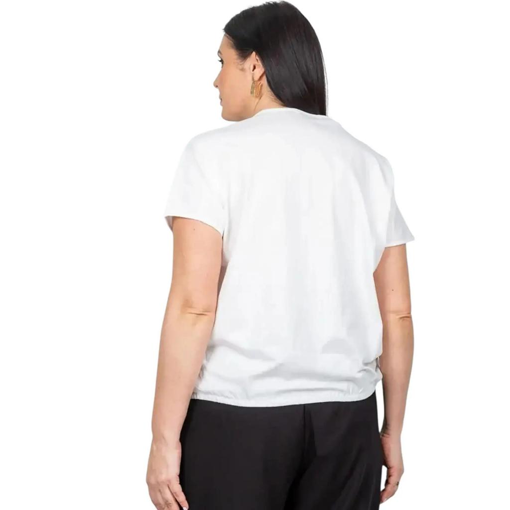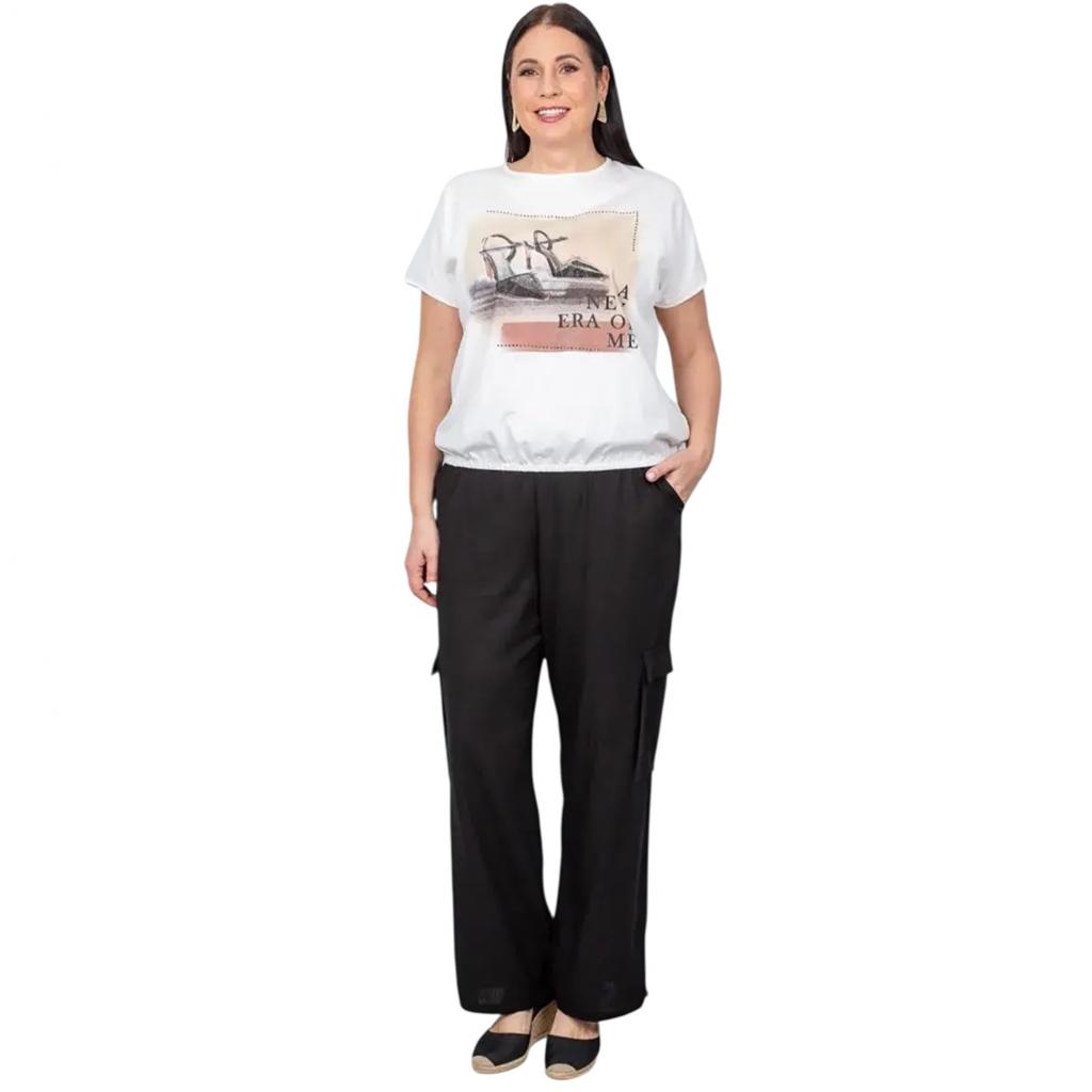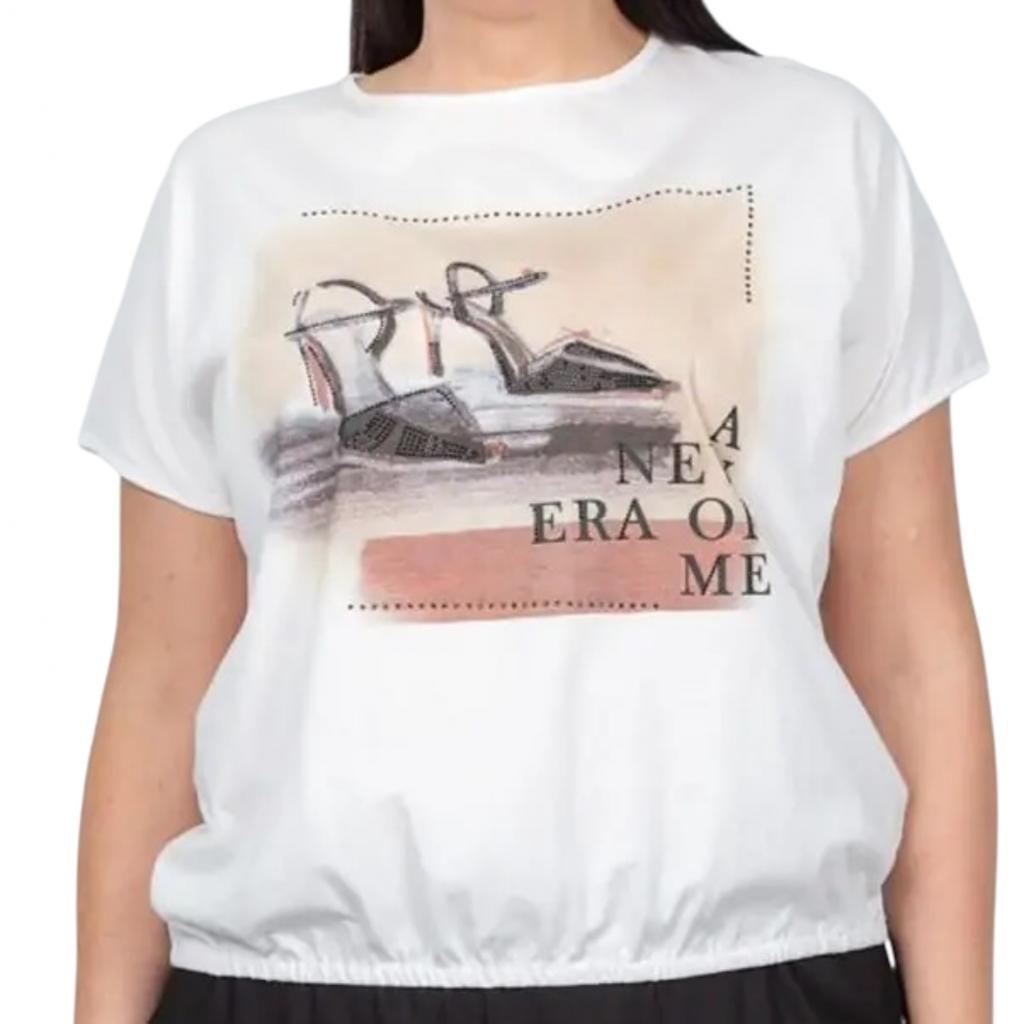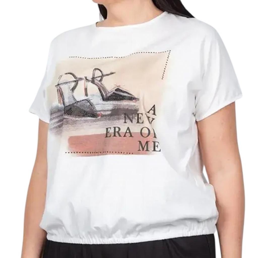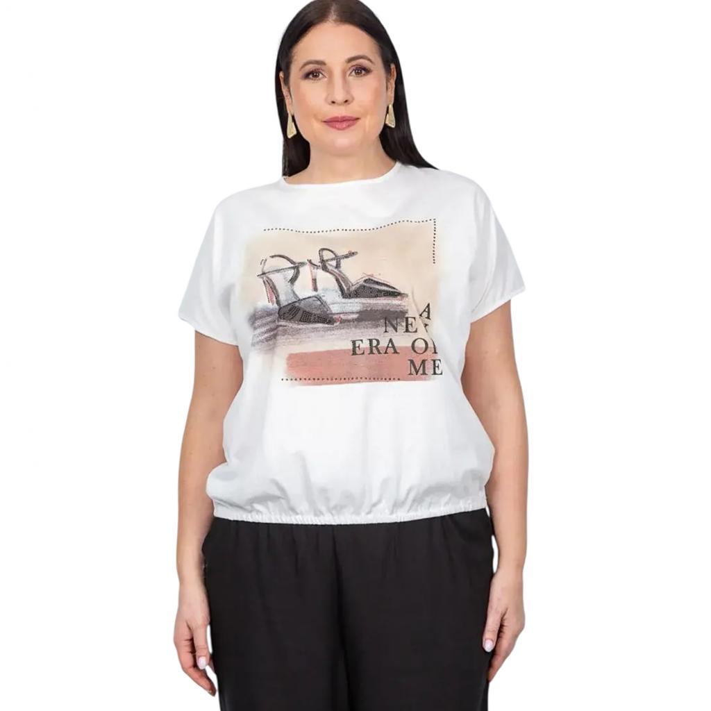 Стильная и удобная трикотажная блуза белого цвета. Эта модель идеально подойдет для жаркого летнего дня, обеспечивая комфорт и легкость. Блуза имеет цельнокроеный фасон, который не облегает фигуру, не сковывает движений. Длина до сгиба бедра позволяет сочетать блузу с различными видами низа – от классических брюк до шорт. Особенностью модели является низ блузы, выполненный на вшитой резинке. Это решение не только придает изделию оригинальности, но и обеспечивает идеальную посадку на любой тип фигуры. Вырез горловины круглый, что делает блузу универсальной и подходящей для разных типов лица. На груди располагается принт с изображением женских туфелек, украшенный стразами. Бежевый фон принта гармонично сочетается с цветом самой блузы, создавая стильный и сдержанный образ.