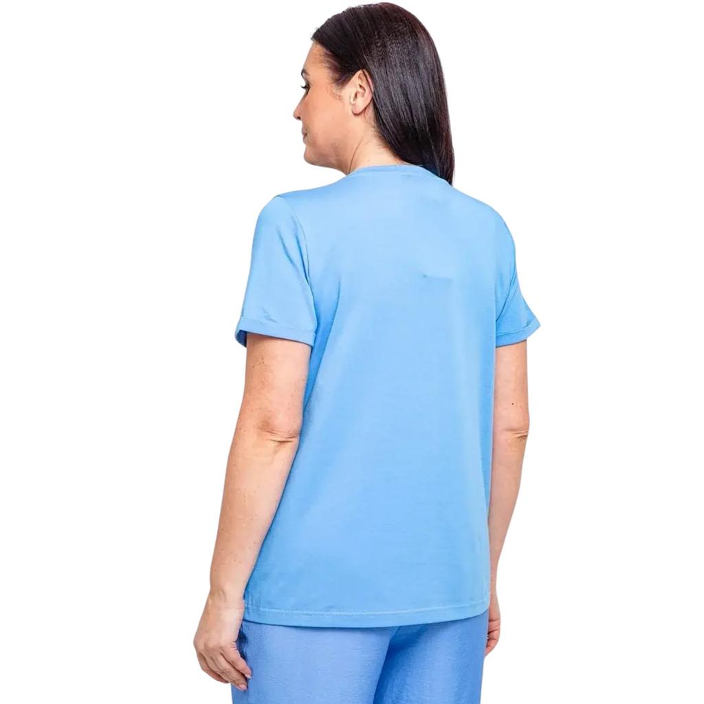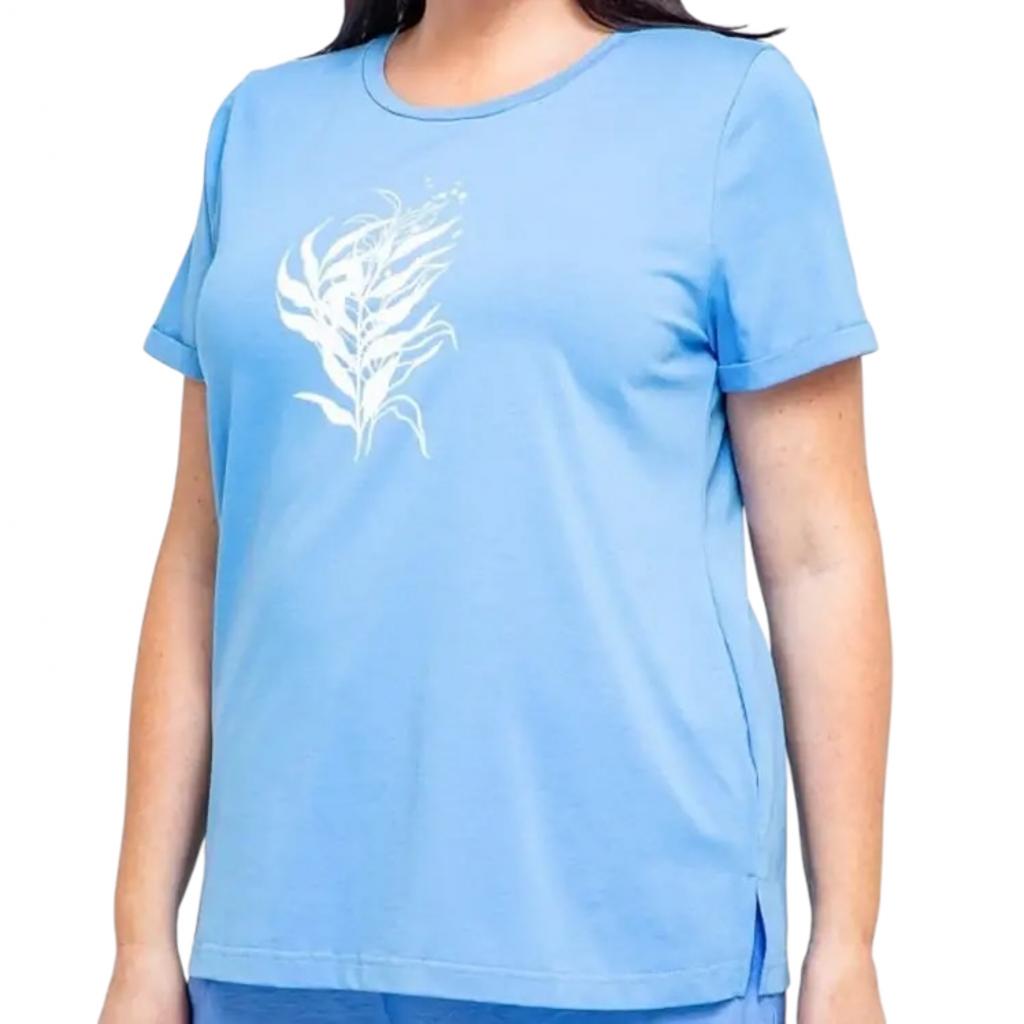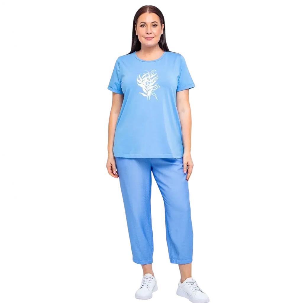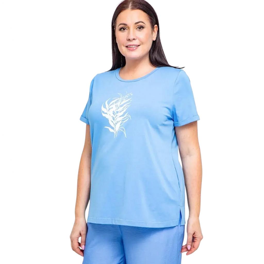 Стильная и удобная трикотажная блуза голубого цвета. Эта модель идеально подойдет для жаркого летнего дня, обеспечивая комфорт и легкость. Блуза имеет прямой фасон с коротким втачным рукавом. Длина до сгиба бедра позволяет сочетать блузу с различными видами низа – от классических брюк до шорт. Вырез горловины круглый, что делает блузу универсальной и подходящей для разных типов лица. На груди располагается белый принт с изображением растений.