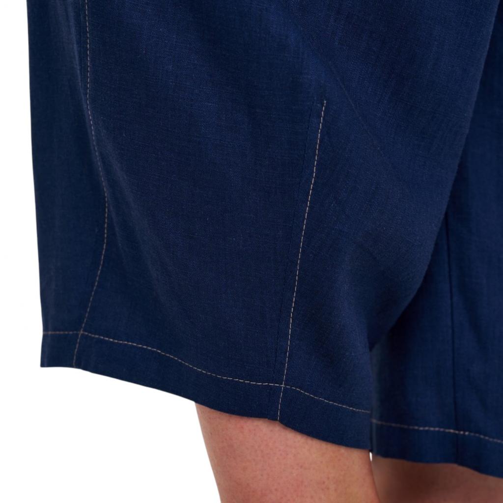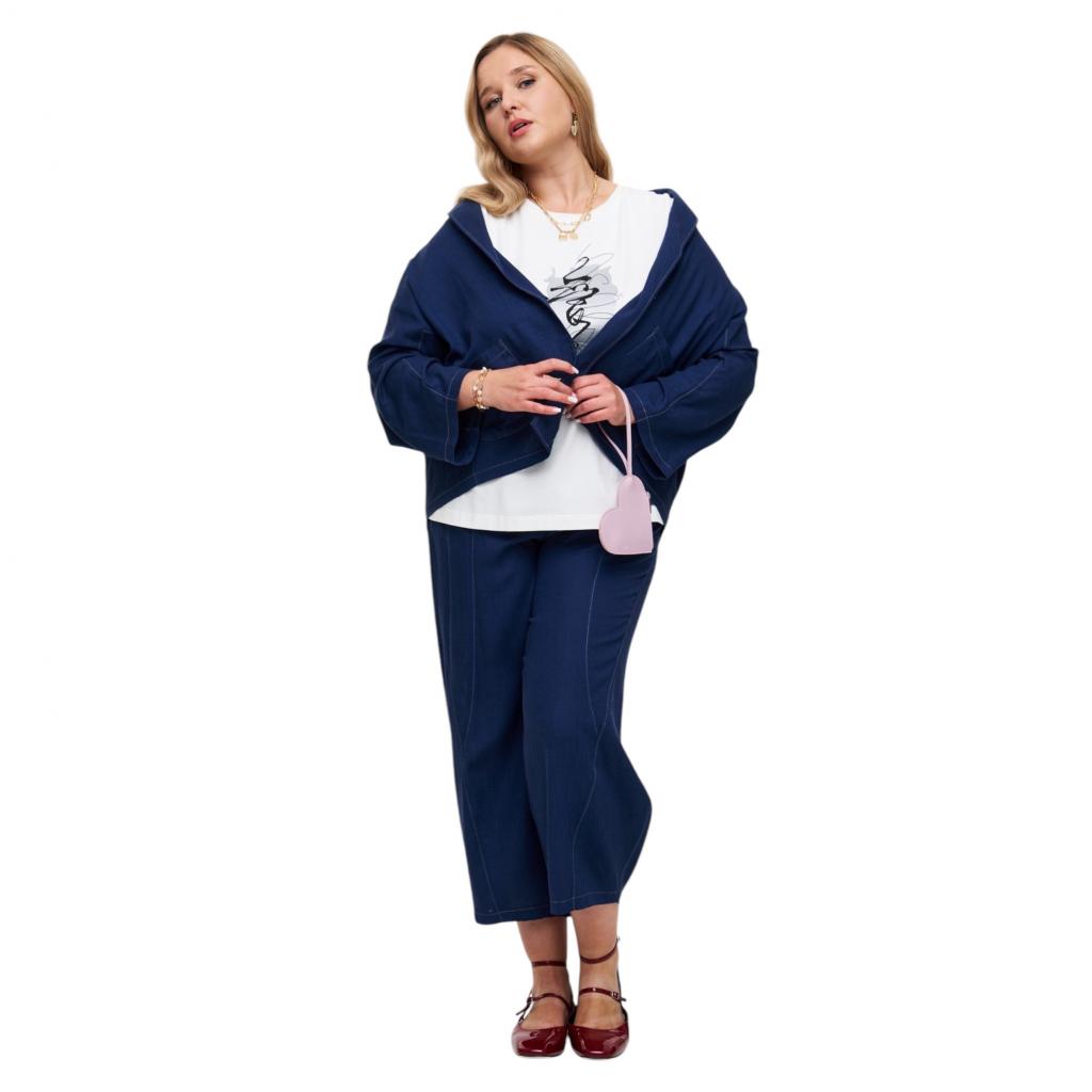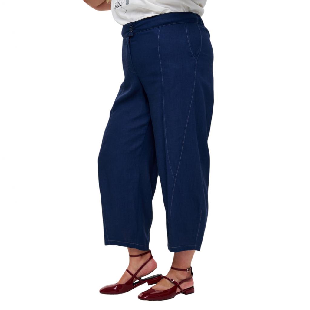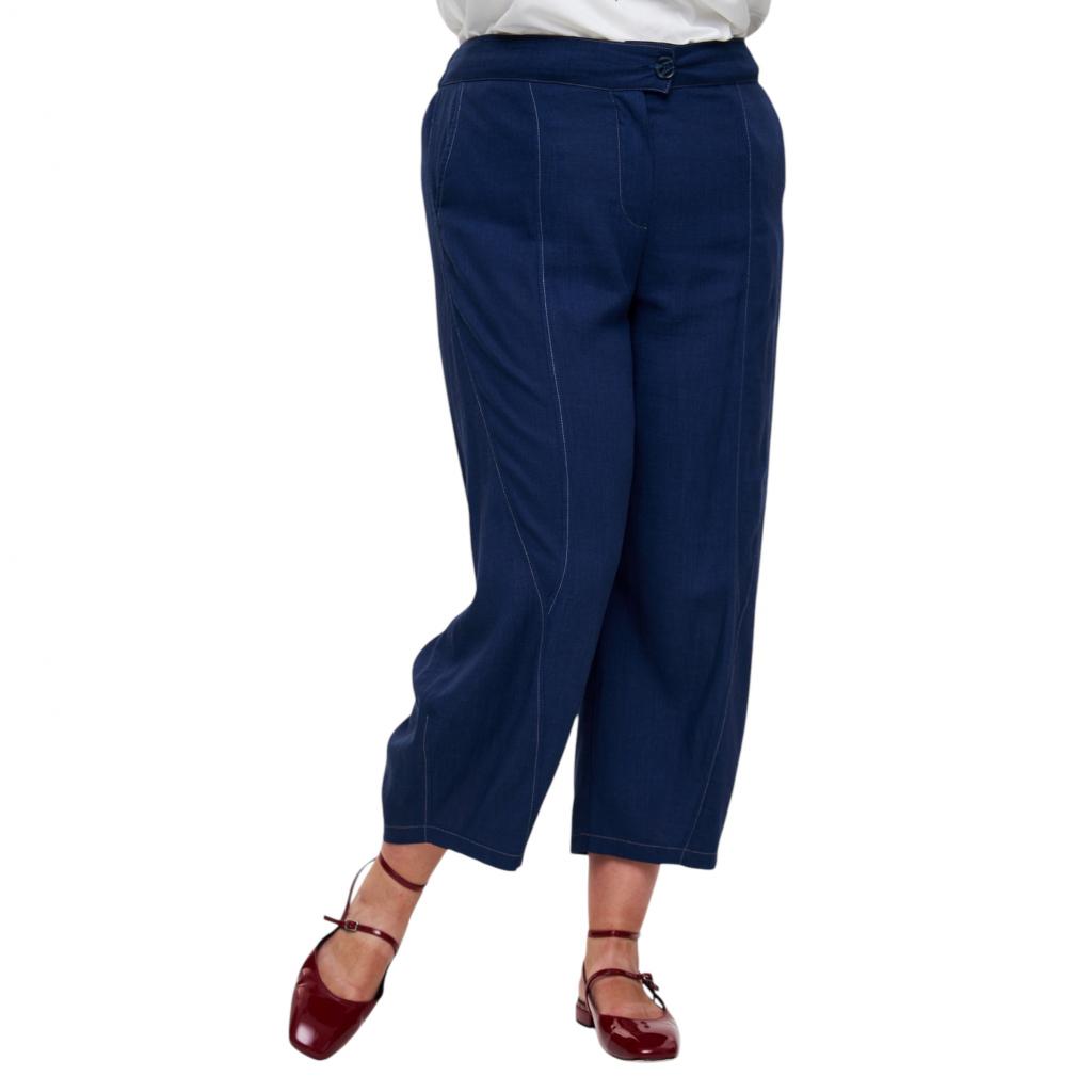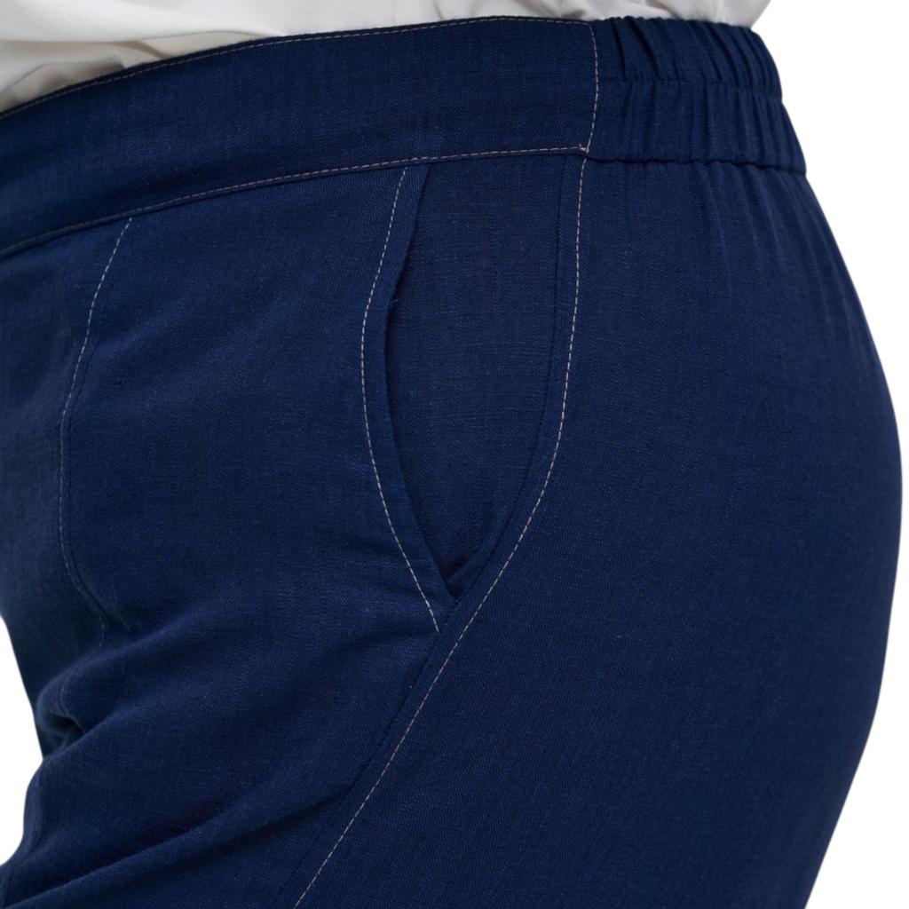 Тёмно-синие летние брюки «бананы» изготовлены из смеси хлопка и льна. Они имеют длину 7/8, функциональные боковые карманы, пояс на резинке и застёжку на пуговицу. Благодаря декоративным отстрочкам белыми нитками эти брюки выглядят стильно и современно. Они идеально сочетаются с жакетом «Бурвиль», создавая комфортный и стильный образ для тёплого времени года.