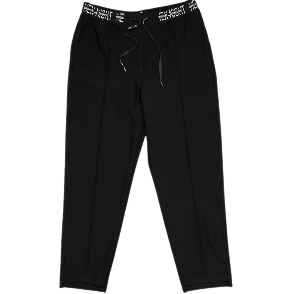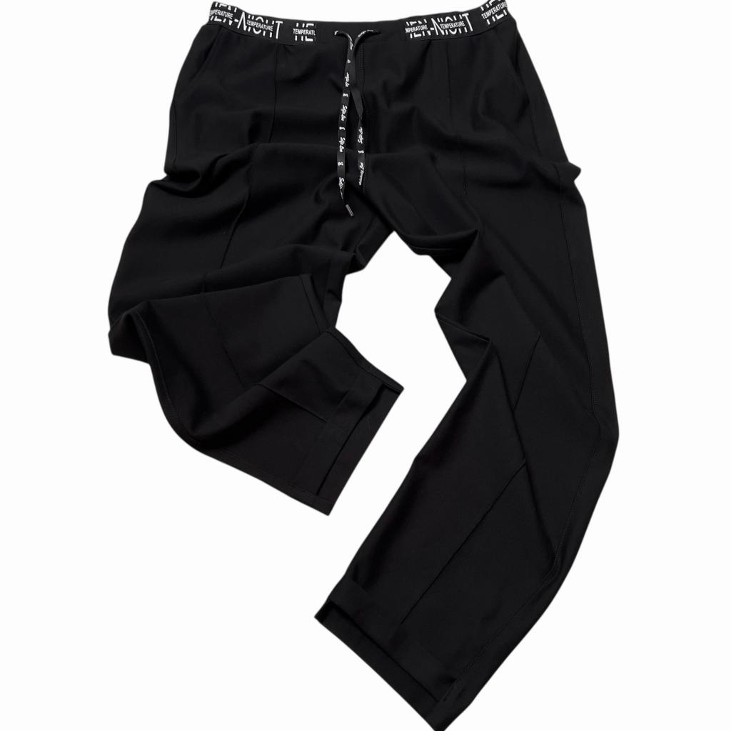 Универсальная модель для современного гардероба. Изысканная длина 7/8 создает утонченный силуэт, подчеркивая красоту ног и визуально вытягивая фигуру. Комфортный пояс на круговой резинке с кулиской обеспечивает идеальную посадку. Стильные белые надписи на поясе добавляют модели современный акцент, делая образ более динамичным и актуальным. Функциональные карманы обеспечивают практичность без ущерба для элегантности силуэта. Отсутствие гульфика делает модель особенно удобной для повседневной носки, а ступенчатая конструкция низа придает брюкам особый характер и утонченность.