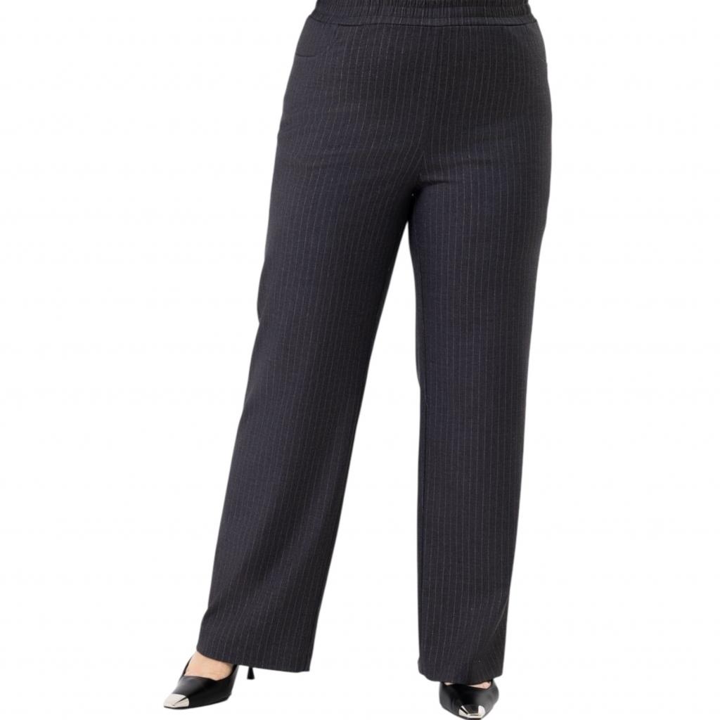 Классические брюки выполнены из костюмной ткани в серую полоску. Пояс на резинке. Имеются два действующих кармана.