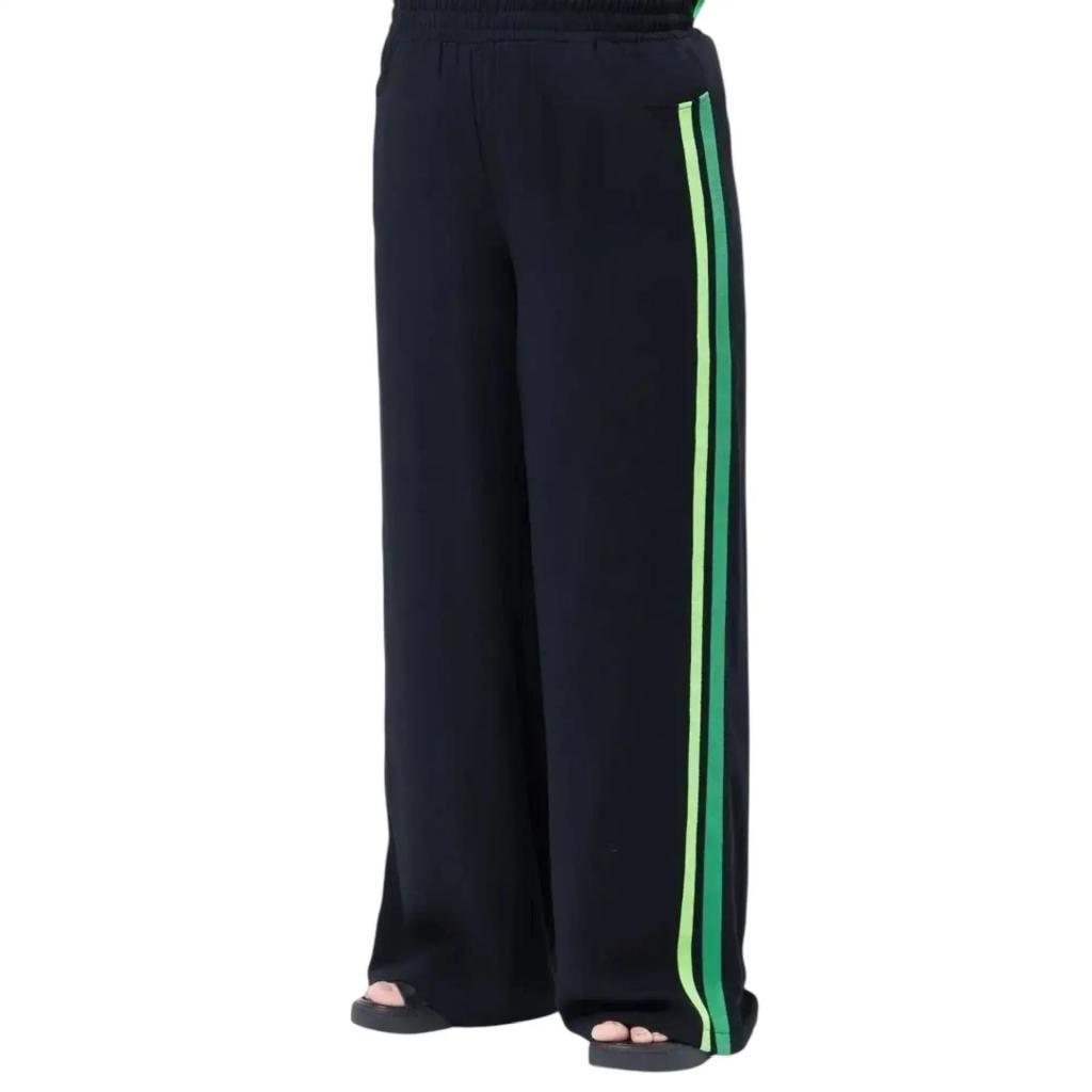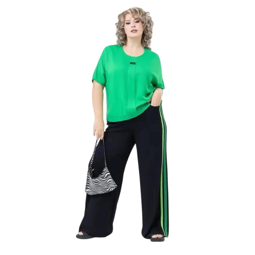 Прямые брюки выполены из ткани « Belmando». Пояс на резинке. По боковым швам лампасы из контрастной ткани. Имеются два действующих кармана.