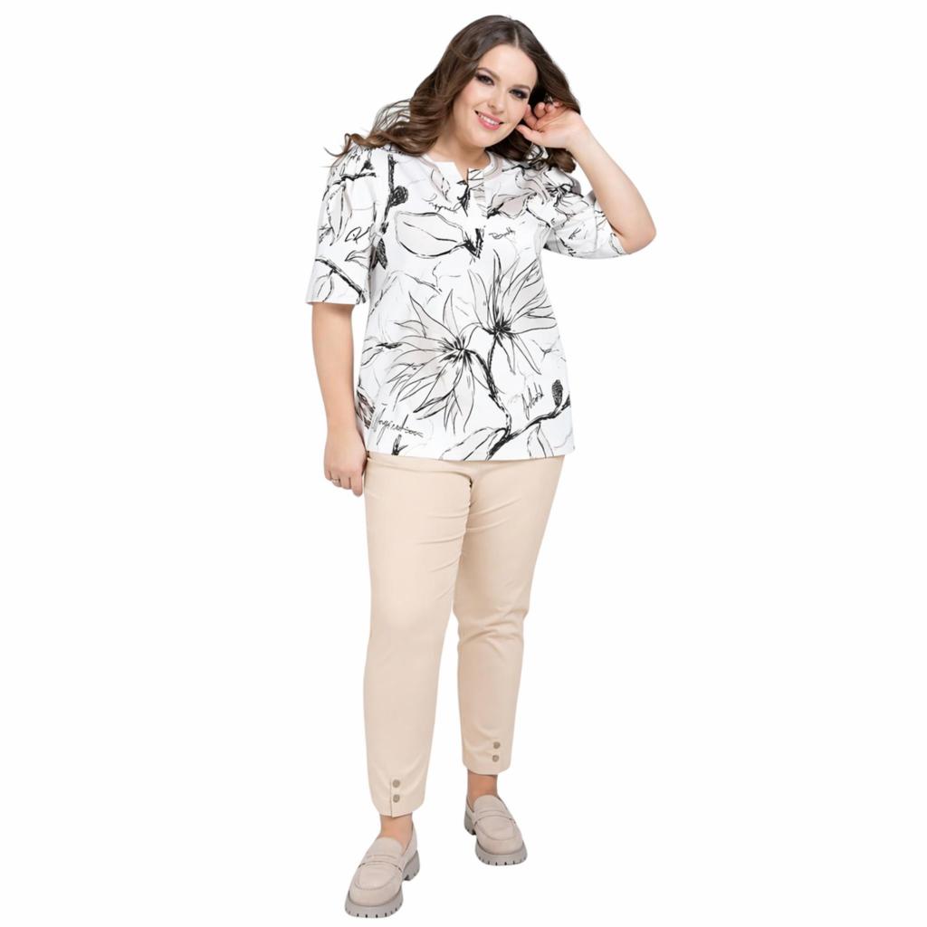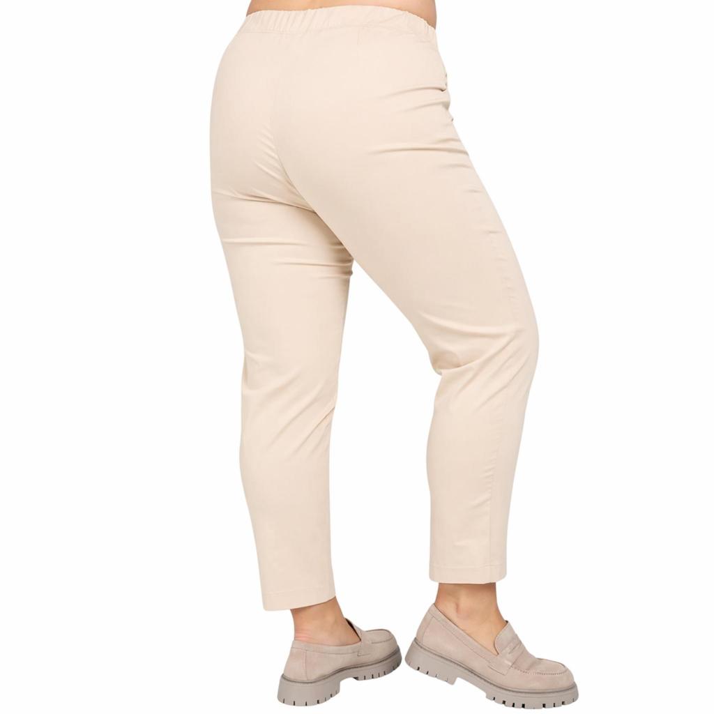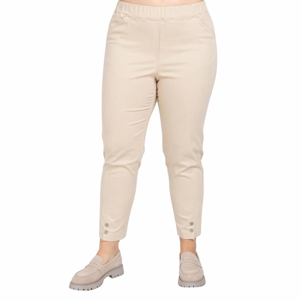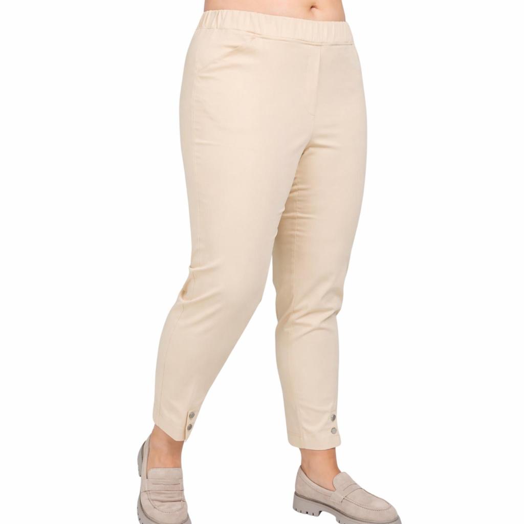Стильные и функциональные летние брюки светло-бежевого цвета. Изготовлены из высококачественного материала с большим содержанием хлопка, который обеспечивает отличную прочность, эластичность и долговечность. Брюки полной длиной и имеют два боковых кармана. Пояс на круговой резинке, имитация гульфика. По переду снизу у брючин имеются разрезы с застежкой на пуговицы.
