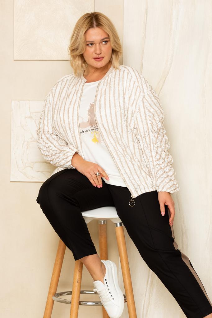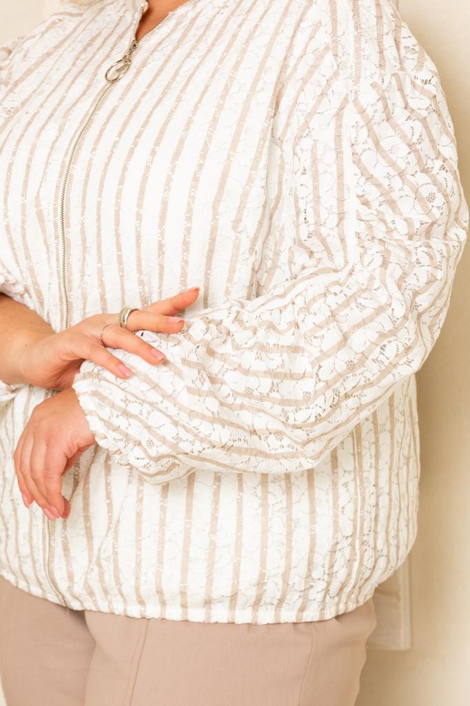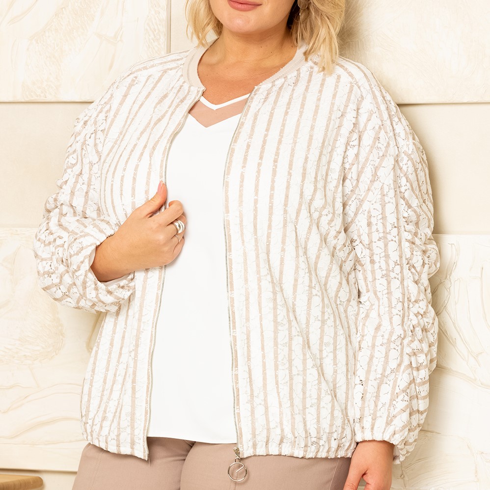 Комфортный бомбер из кружевного полотна на подкладе штапель, для модной женщины. Стильный бомбер будет актуально смотреться в любое время года и подойдет для работы в офисе, прогулки в парке. В весенний и летний период может служить демисезонной верхней одеждой, заменит легкую куртку или ветровку в прохладный день. Детали: спущенное плечо, рукав двухшовный с сборкой вдоль шва, придаёт необычность изделию. Застёжка молния по центру, по низу рукава и изделия тонкая резинка.