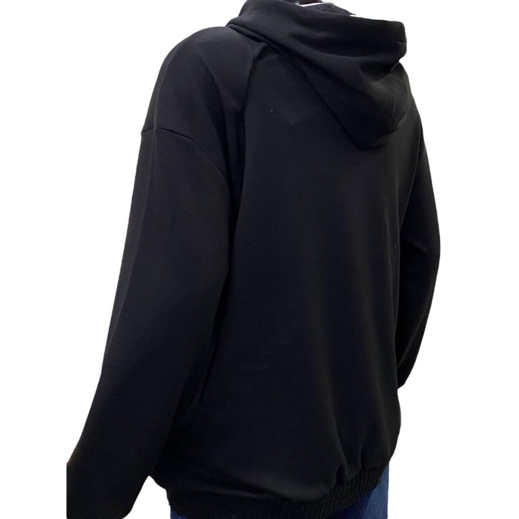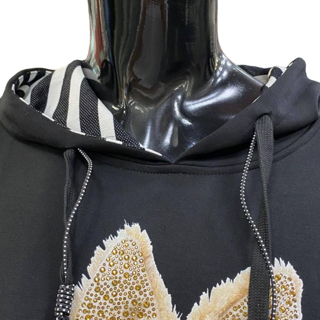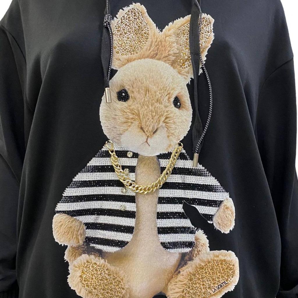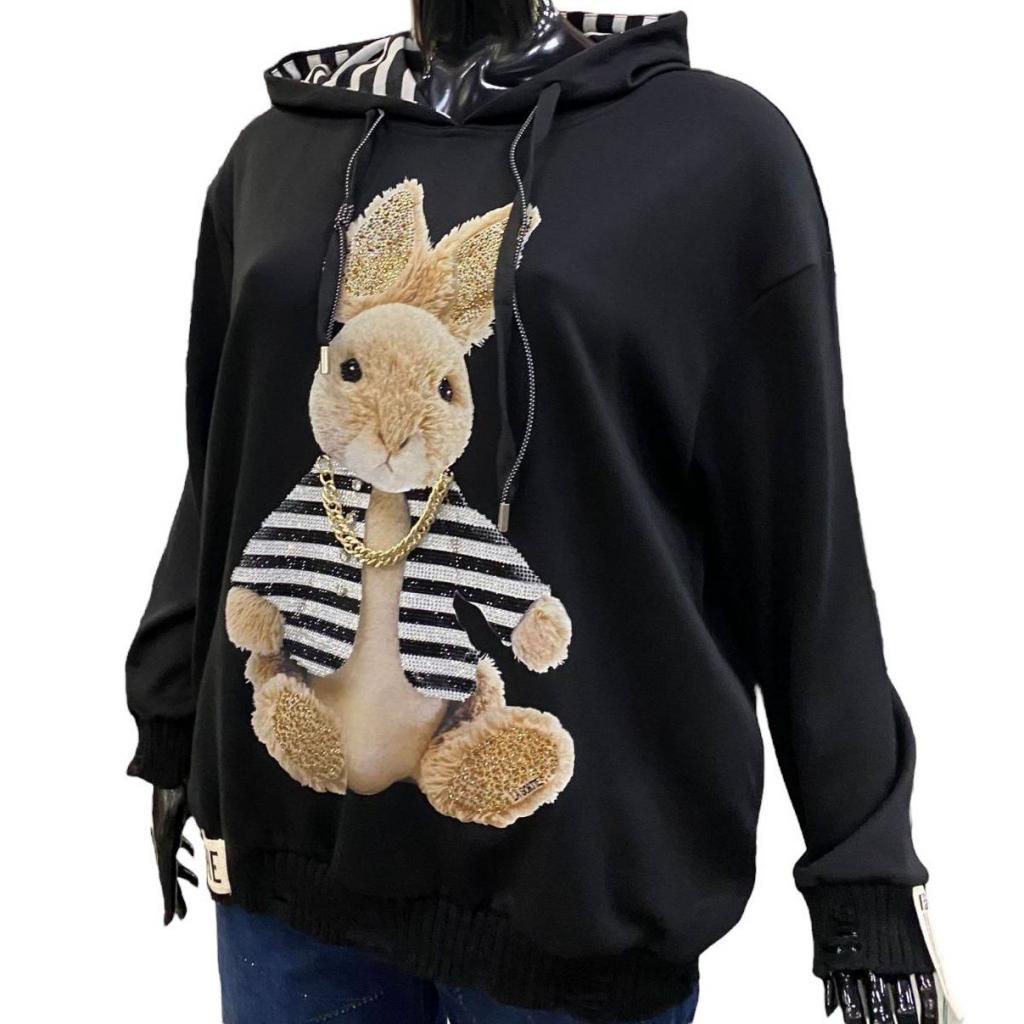 Стильная молодёжная толстовка черного цвета идеально подходит для создания современного молодёжного образа. Он имеет длину до сгиба бедра, капюшон на кулиске с оригинальным шнурком, втачные рукава полной длины и манжеты на трикотажной резинке внизу изделия и рукавов. В боковых швах два действующих кармана. Капюшон изнутри отделан тканью в черно-белую полоску, резинка на манжетах с оригинальной "дранкой" и белыми патчами. Яркий принт - мультяшный кролик, украшенный разноцветными стразами и цепочкой, добавляет изюминку и делает эту толстовку ещё более привлекательной.