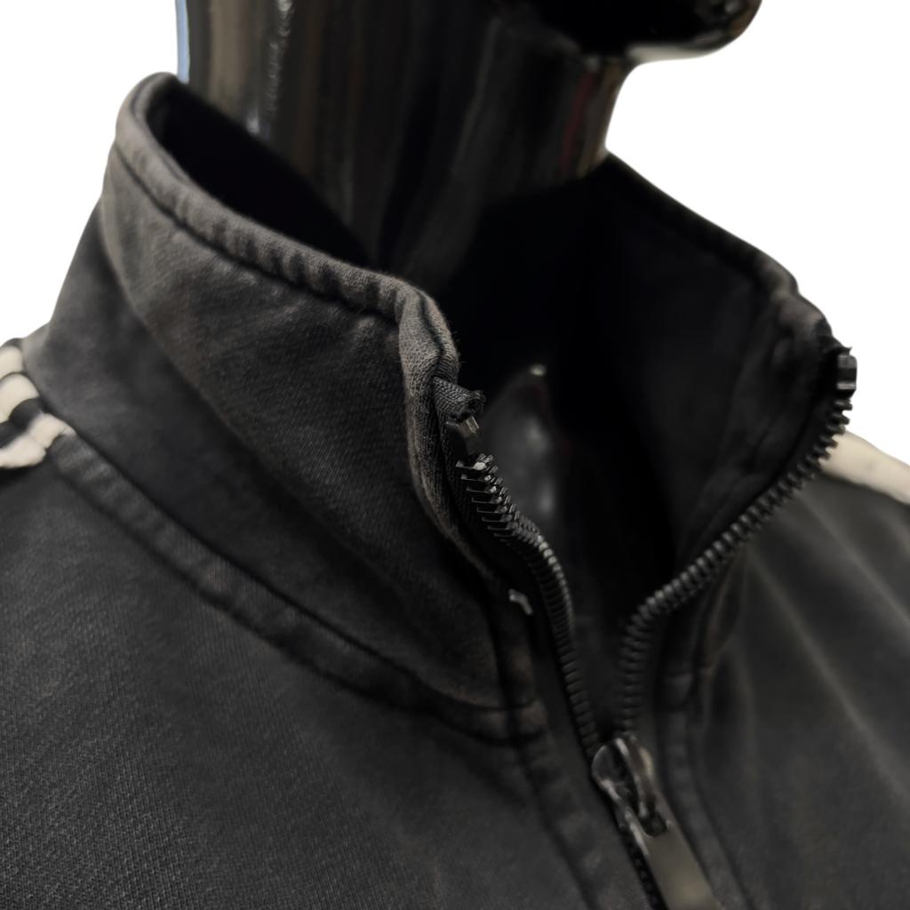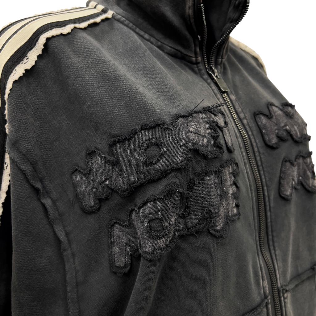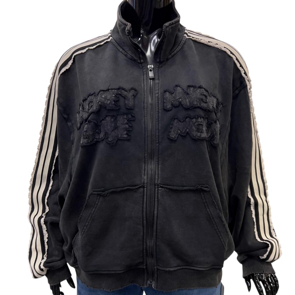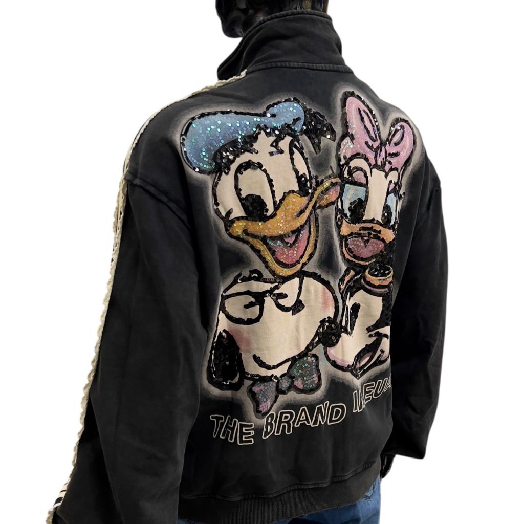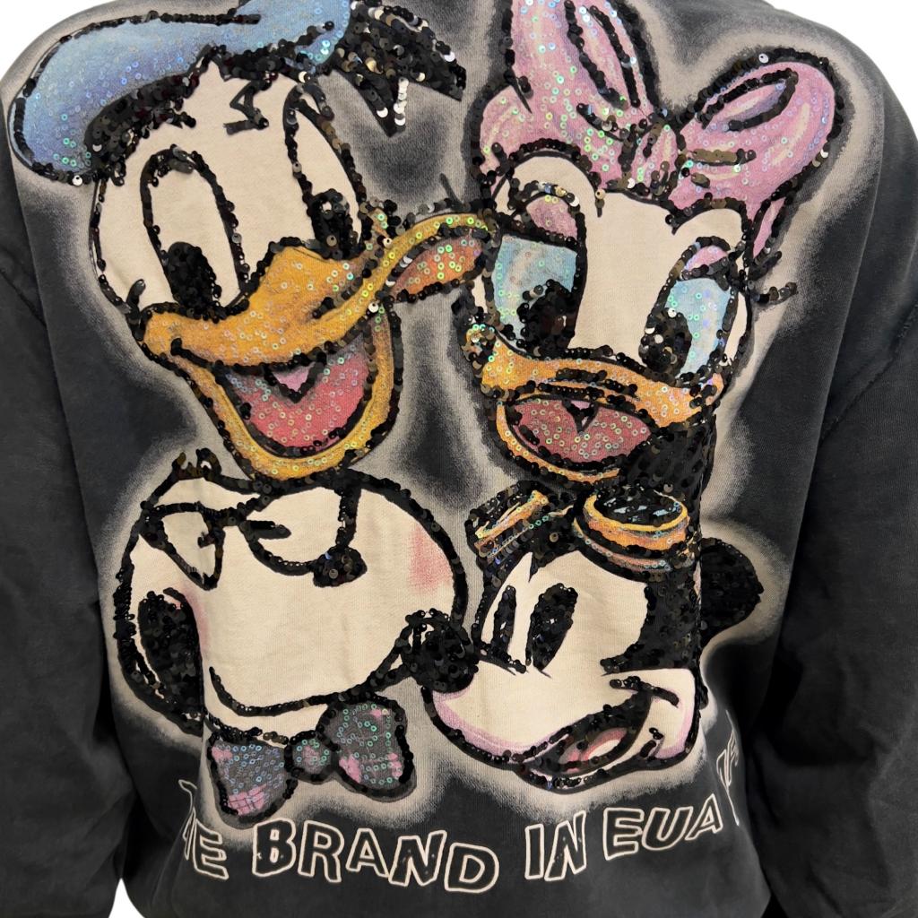 Стильная молодёжная толстовка черного цвета идеально подходит для создания современного молодёжного образа. Она имеет длину до начала бедра, воротник стойку, втачные рукава полной длины и манжеты на трикотажной резинке, нижний край изделия на резинке. Резинка изделия отделана оригинальной "дранкой". Яркий принт - мультяшные герои, украшенный вышивкой и пайетками, добавляет изюминку и делает эту толстовку ещё более привлекательной. На спине изделия надписи крупными буквами.