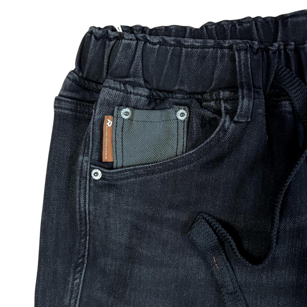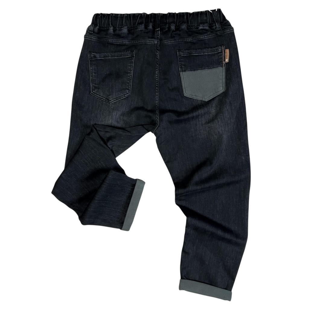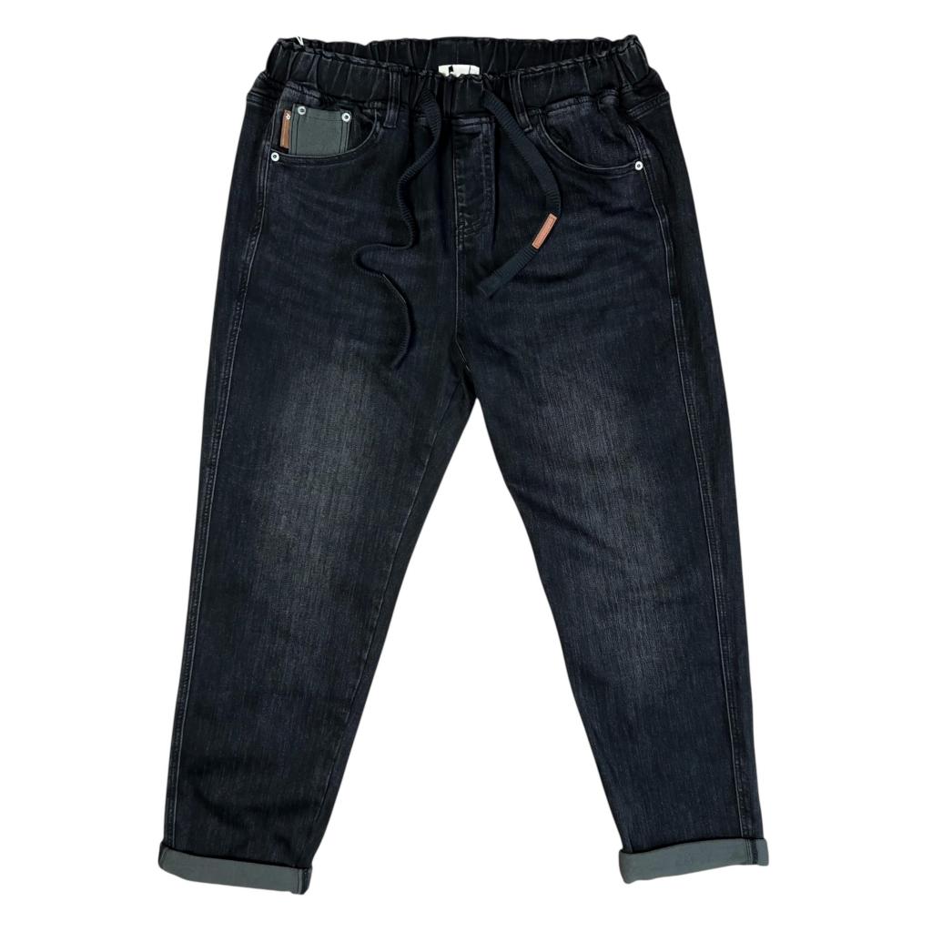 Зауженные черные джинсы с небольшой выворкой полной длины представляют собой стильный и современный осенний вариант. Пояс на круговой корсажной резинке обеспечивает комфортную посадку на талии. На поясе имеются шлевки для ремня, а имитация гульфика создает классический вид джинсов. Передние и задние карманы функциональны и украшены клепками для дополнительного эффекта. Через кулиску на поясе продет оригинальный шнурок черного цвета, что придает изделию особый шарм.