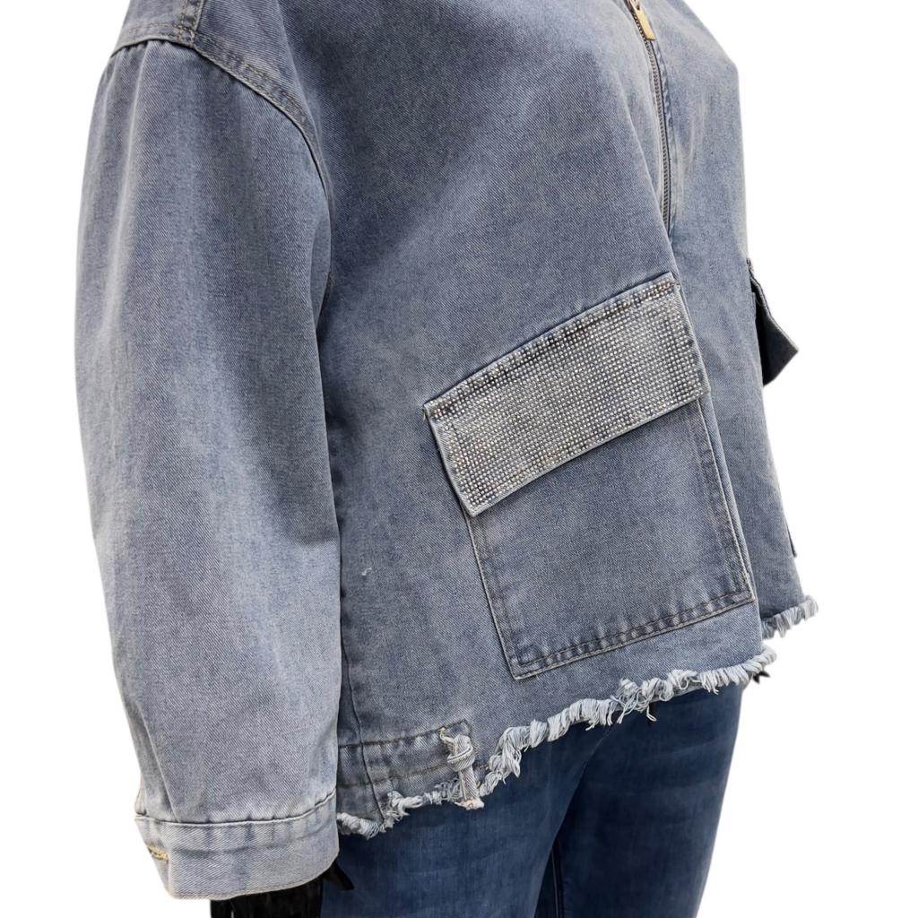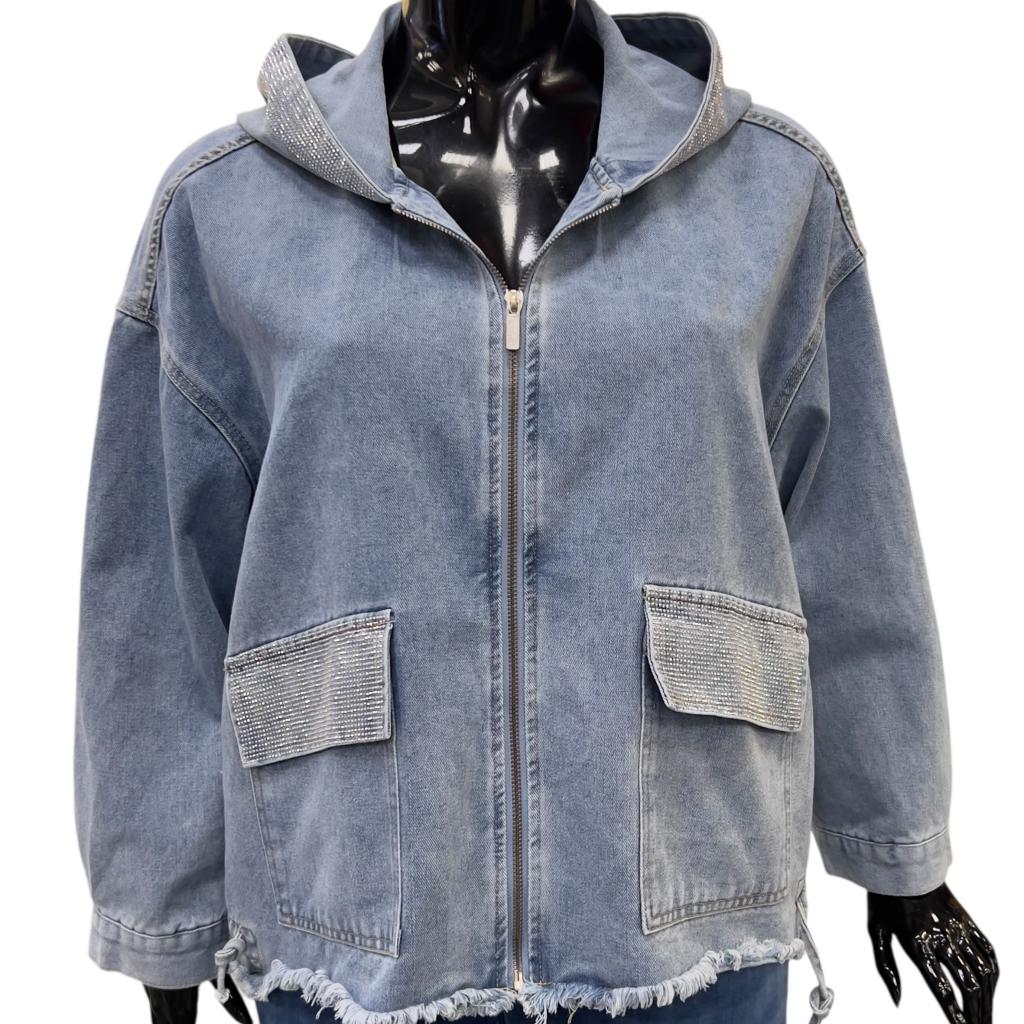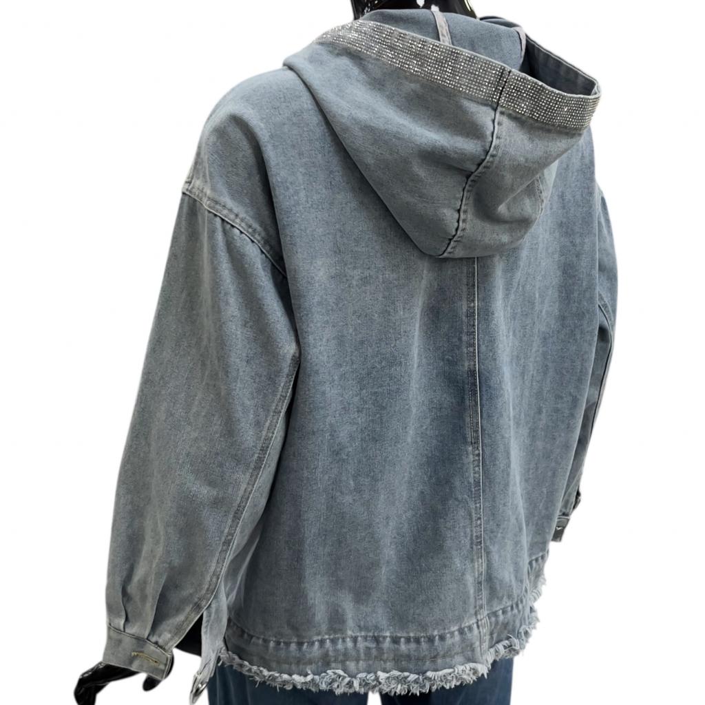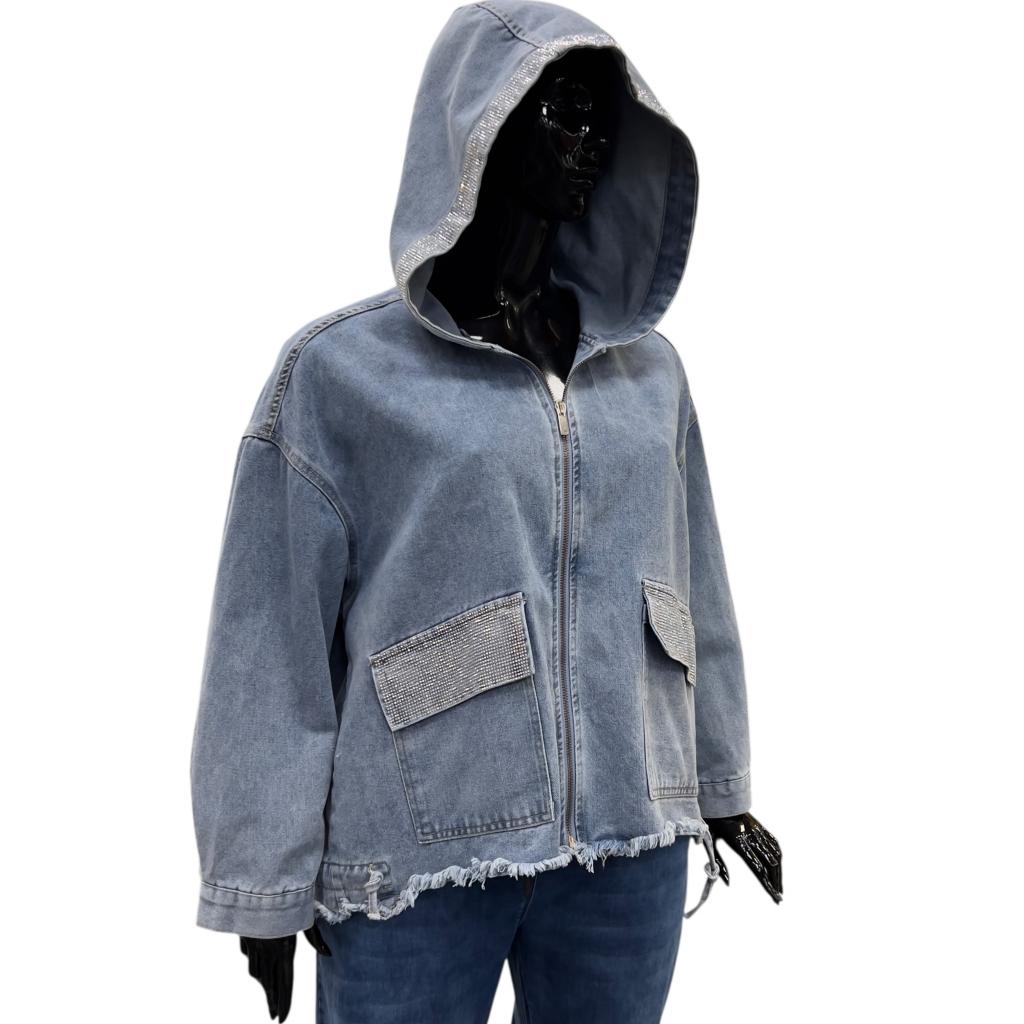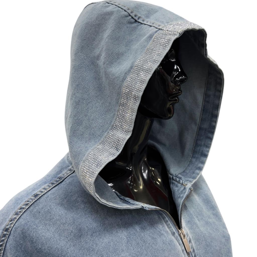 Голубая укороченная джинсовая куртка прямого силуэта - идеальный выбор для любителей комфорта и стиля. Ее длина до сгиба бедра позволяет носить ее с различными типами низа. Рукав втачной, полной длины и капюшон придают куртке современный вид. Застежка на серебристую молнию, большие накладные кармаы с клапанами, необработанный низ завершают образ, делая его неповторимым. Клапаны карманов и капюшон украшены россыпью страз.