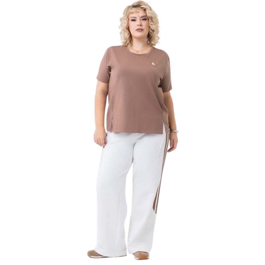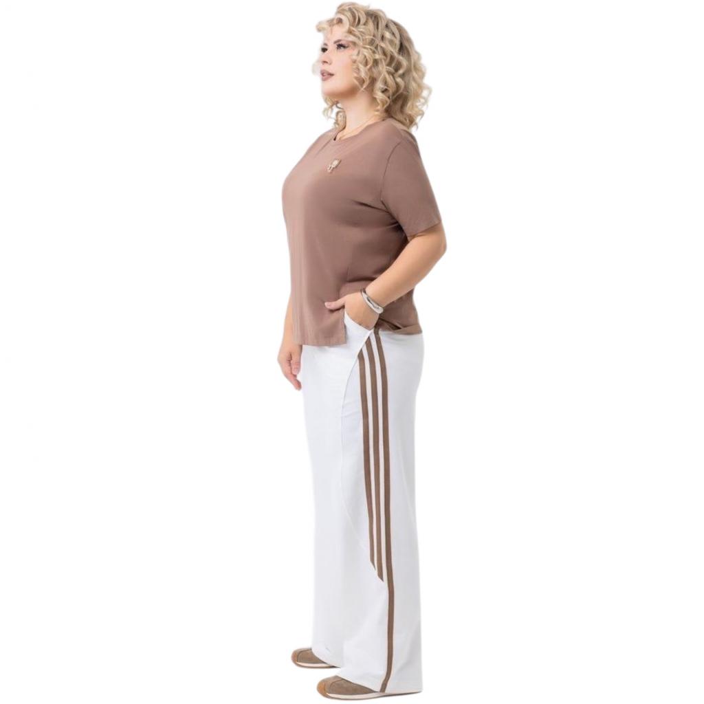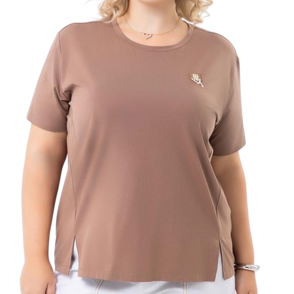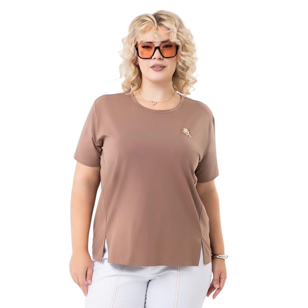 Модель выполнена из ткани «Модал». Круглый вырез горловины. Рукав втачной, короткий.По полочке нашивка.