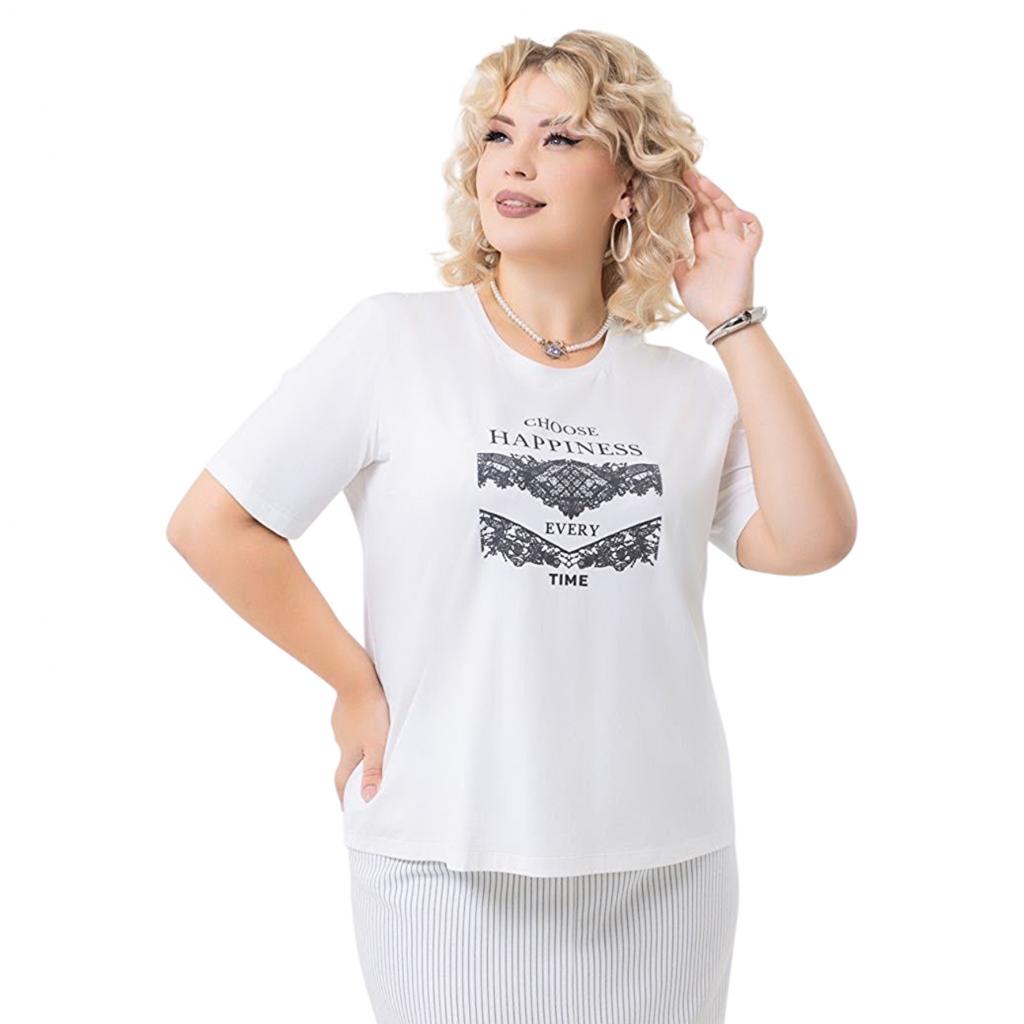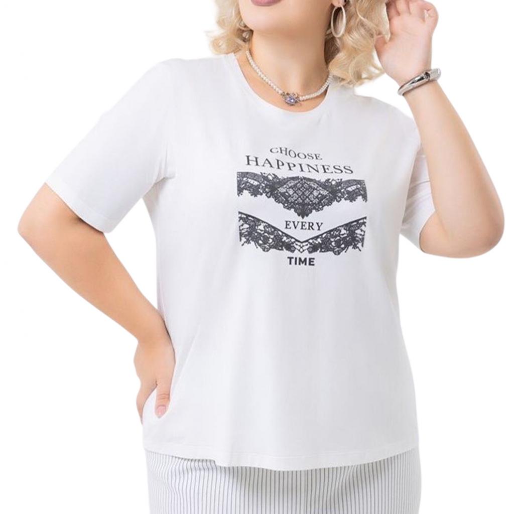 Вырез горловины круглый. Рукав втачной, короткий. По полочке — печать.