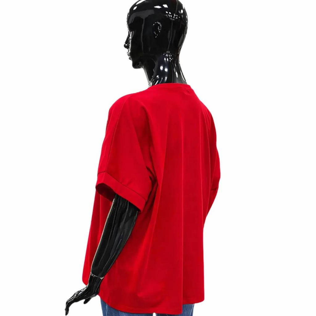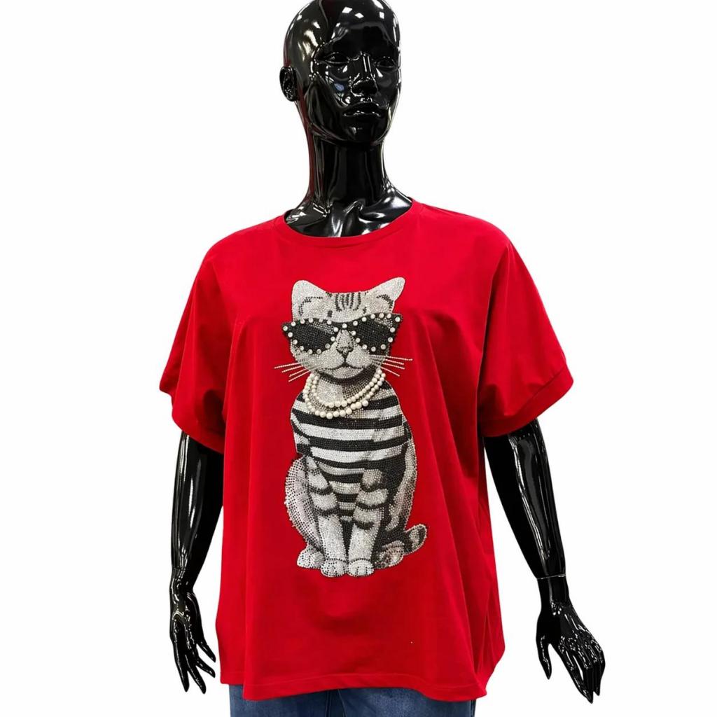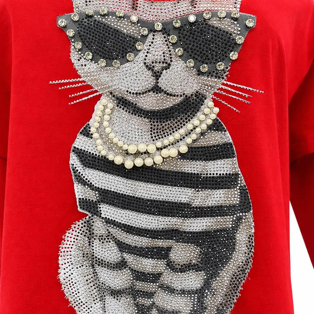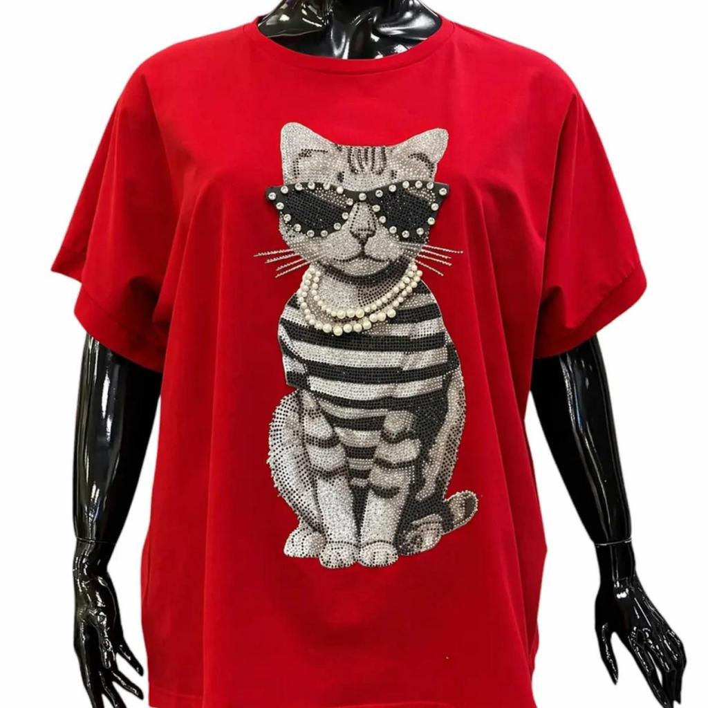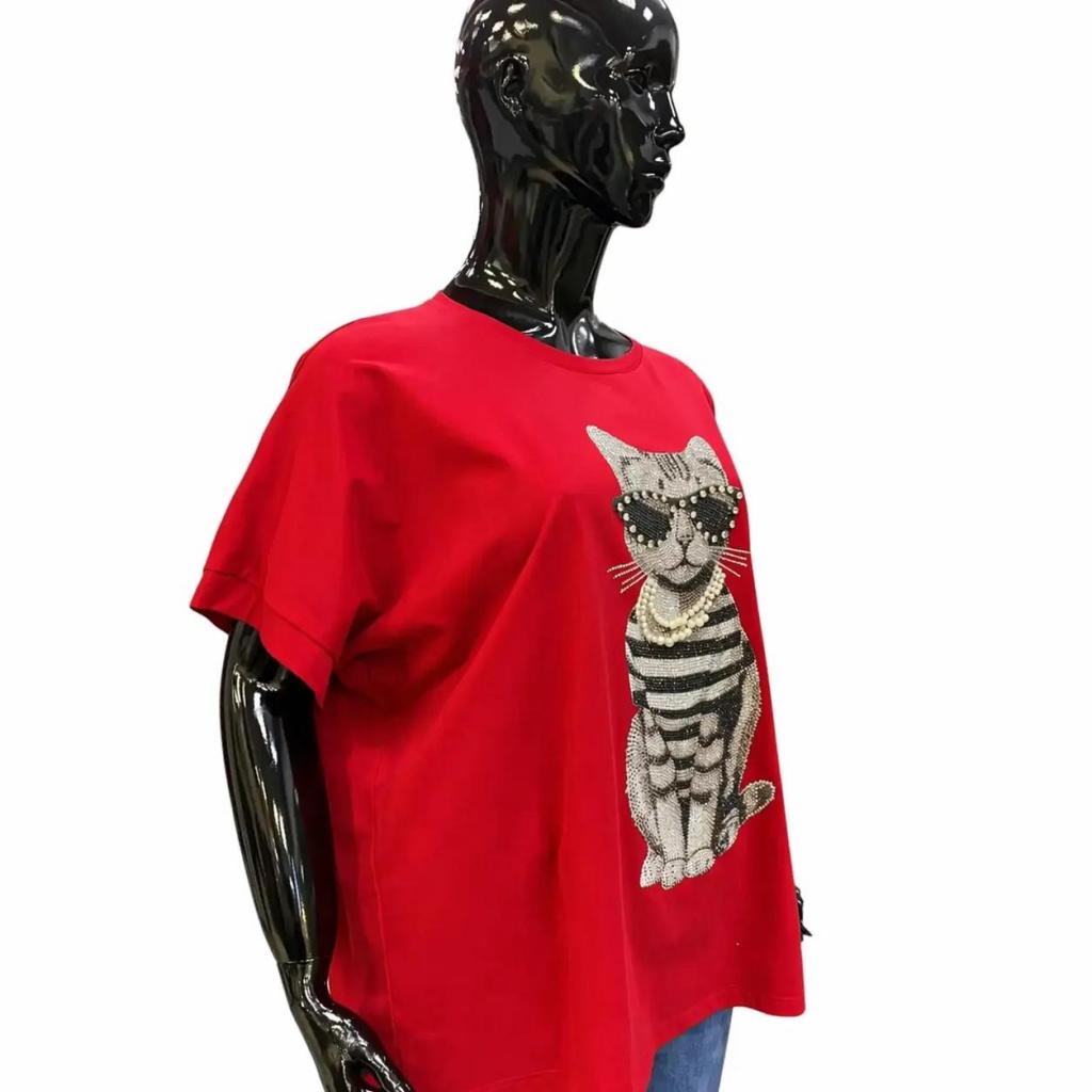 Красная футболка прямого кроя — идеальный выбор для тех, кто хочет выглядеть стильно и ярко. Благодаря своей длине чуть ниже начала бедра, она прекрасно сочетается с различными низами, будь то джинсы, брюки или юбки. Главным акцентом этой футболки является игривый принт на груди - кошка в очках из страз и жемчужин. Круглый вырез горловины и цельнокройный короткий рукав обеспечивают комфорт и свободу движений.