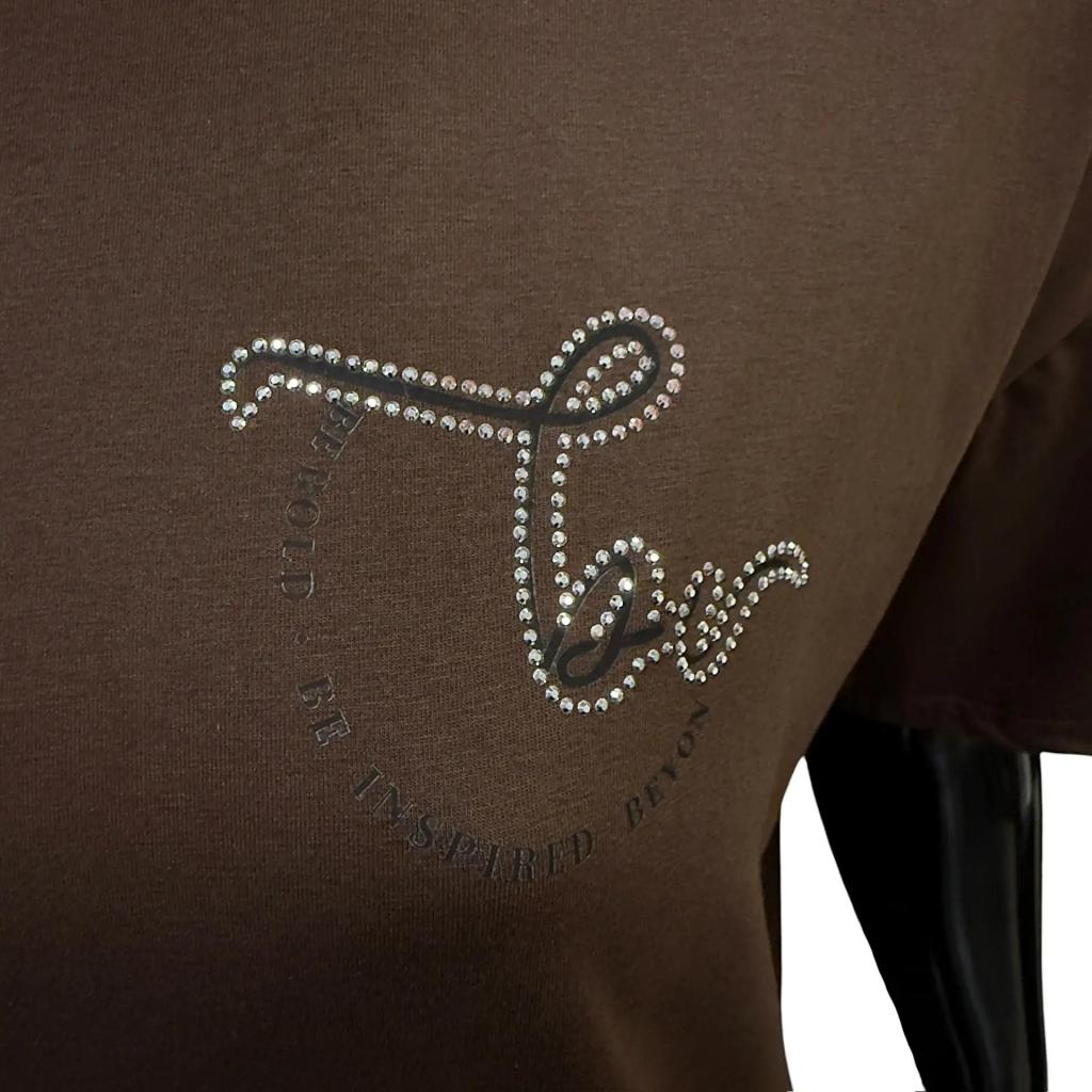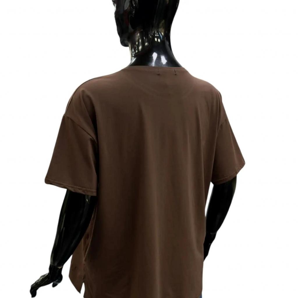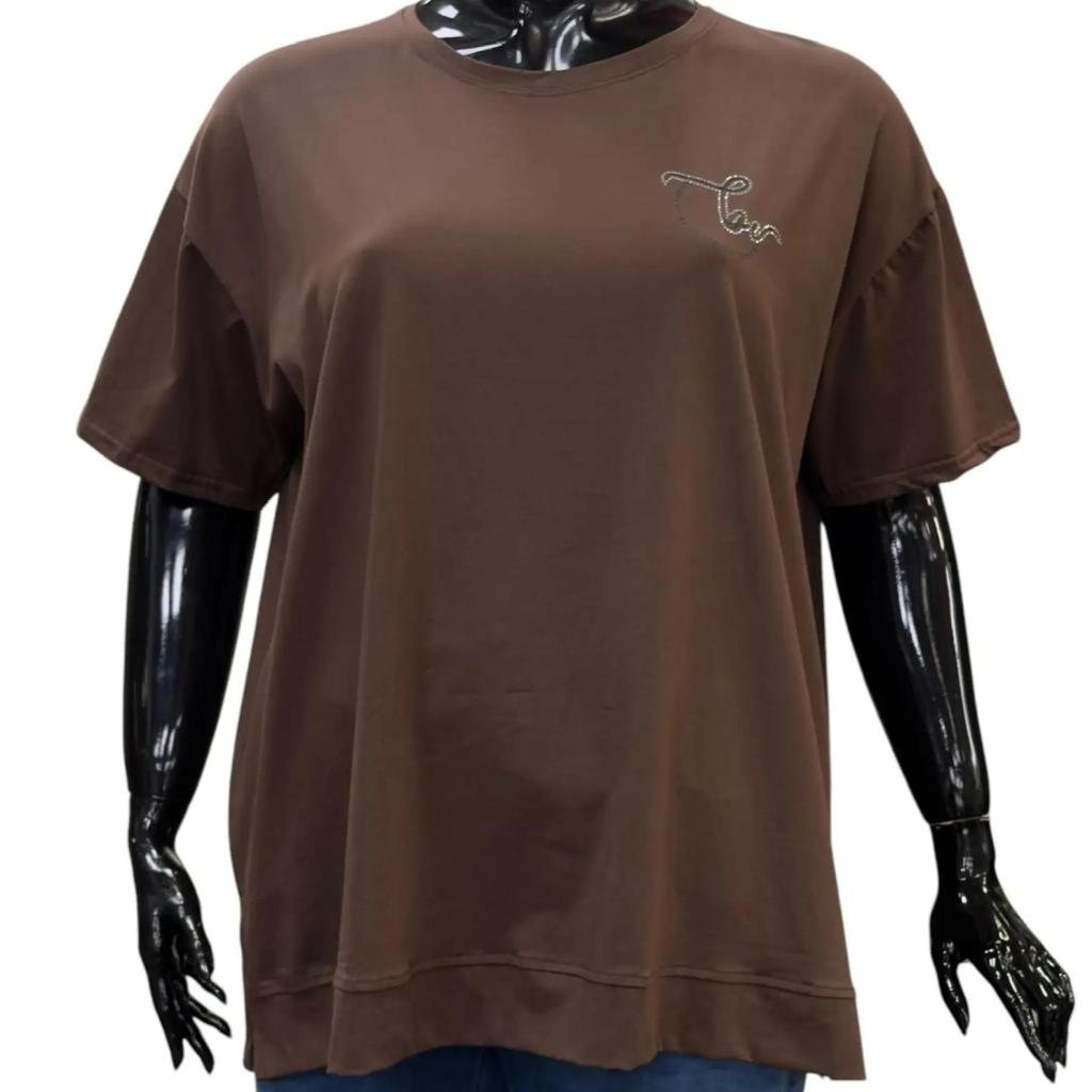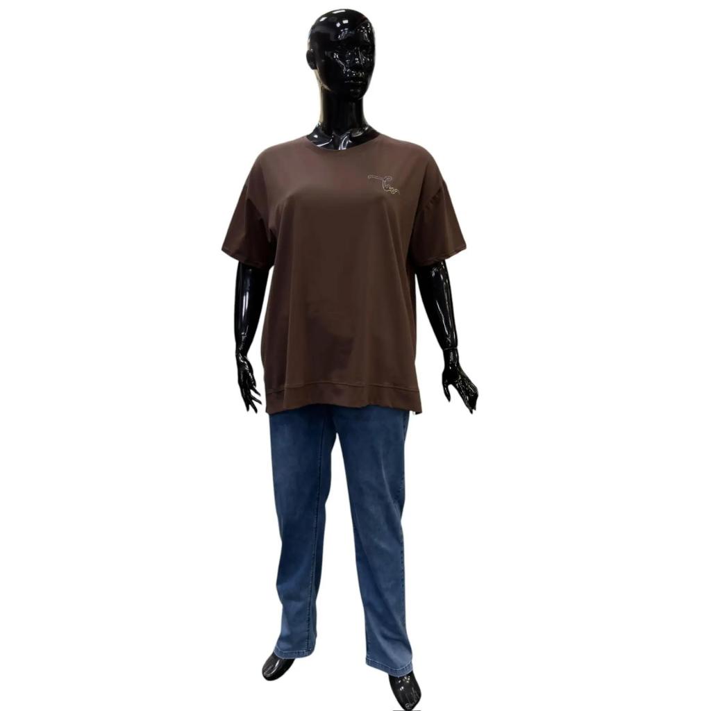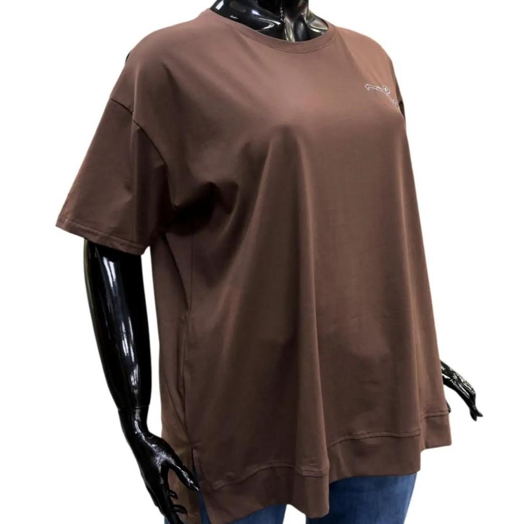 Футболка шоколадного цвета и прямого силуэта идеально подойдет для любителей комфорта. Ее длина чуть ниже сгиба бедра позволяет сочетать ее с различными брюками и джинсами, а круглый вырез горловины обеспечивает удобную посадку. Втачной короткий рукав добавляет нотку изящества. Слева на груди элегантная надпись расположенная полукругом подчеркивает романтический характер футболки. Разрезы снизу в боковых швах делают образ более интересным и обеспечивают идеальную посадку по фигуре.