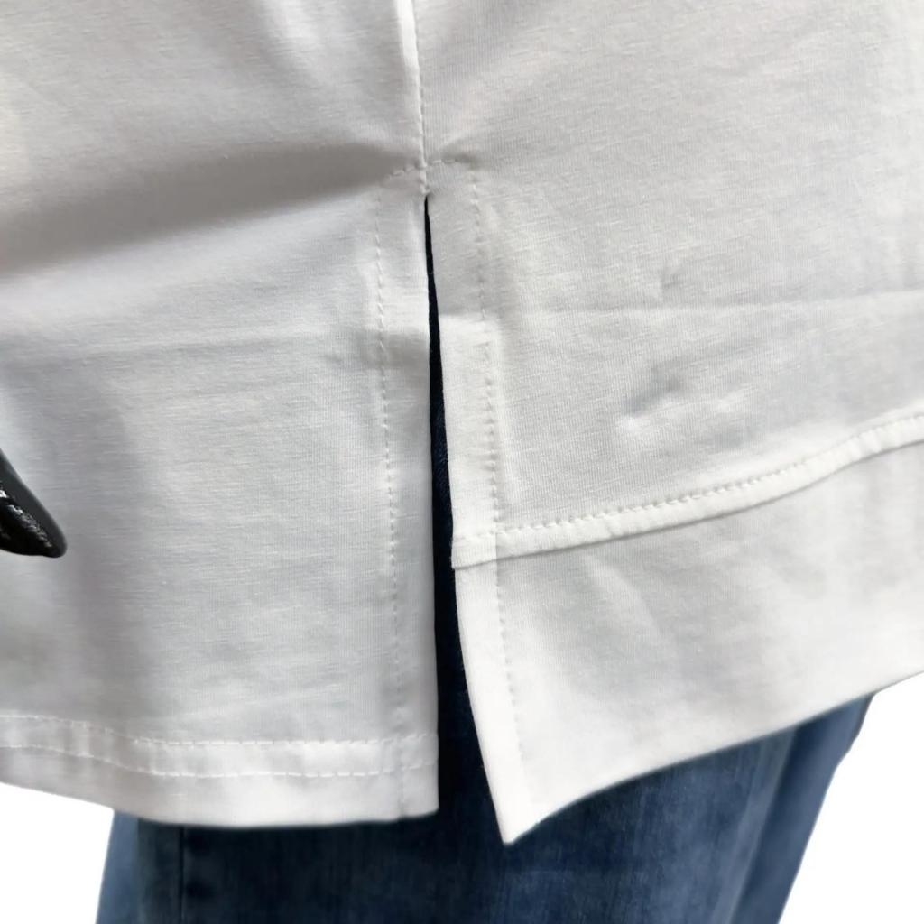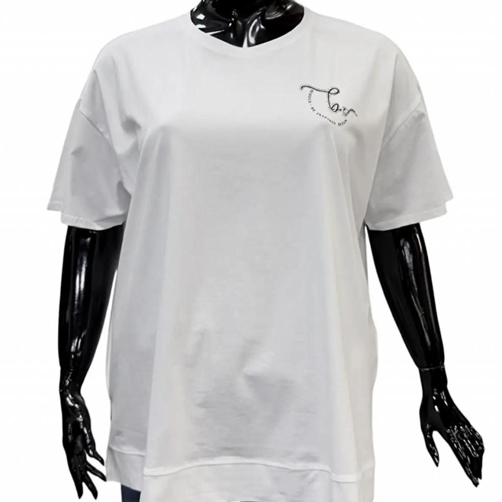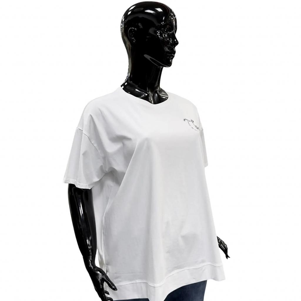 Футболка белого цвета и прямого силуэта идеально подойдет для любителей комфорта. Ее длина чуть ниже сгиба бедра позволяет сочетать ее с различными брюками и джинсами, а круглый вырез горловины обеспечивает удобную посадку. Втачной короткий рукав добавляет нотку изящества. Слева на груди элегантная надпись расположенная полукругом подчеркивает романтический характер футболки. Разрезы снизу в боковых швах делают образ более интересным и обеспечивают идеальную посадку по фигуре.