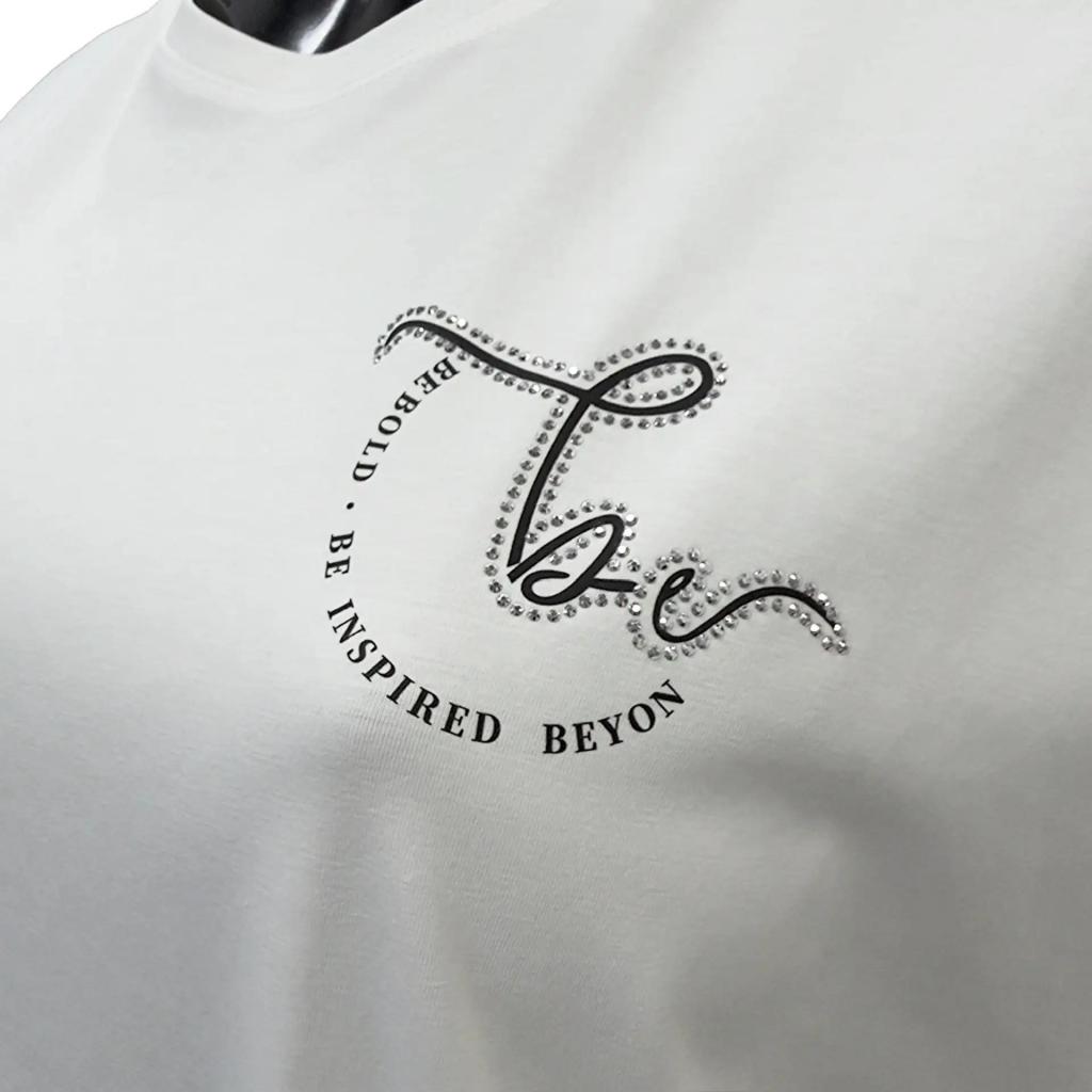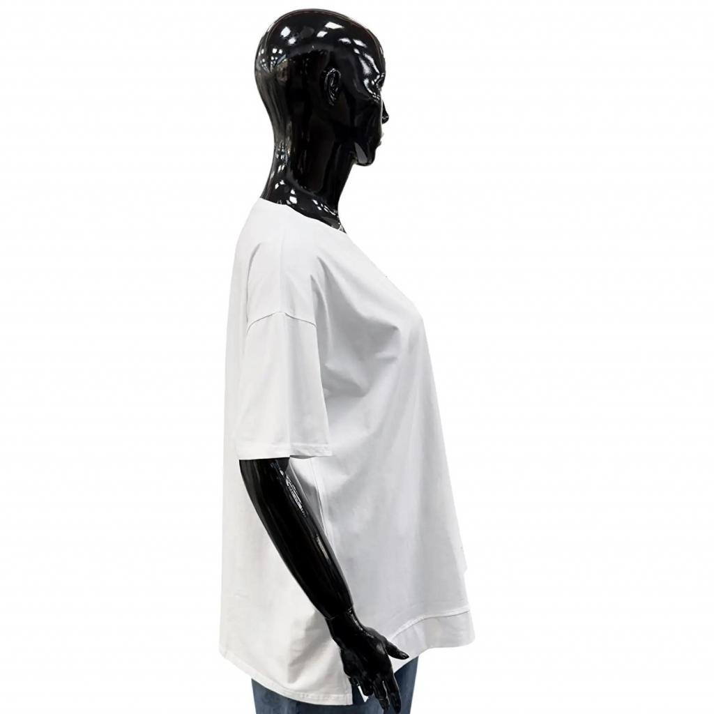 Главным украшением футболки является принт на груди слева в виде букв "bv" украшенных стразами. Этот элемент добавляет нотку оригинальности и стиля.Такая модель станет отличным выбором для повседневной носки или особого случая, в зависимости от того, с чем вы ее сочетаете.