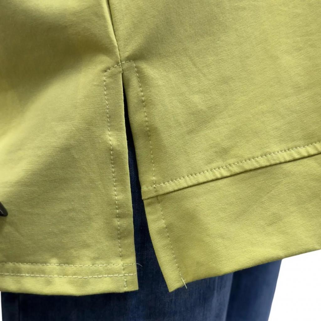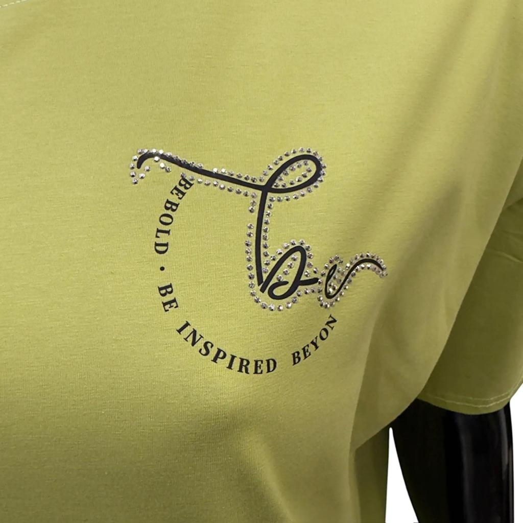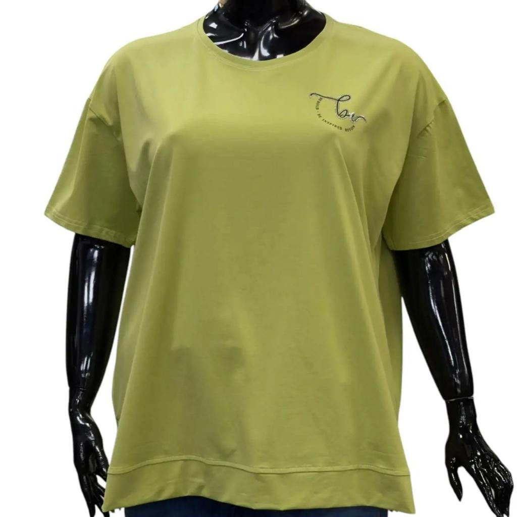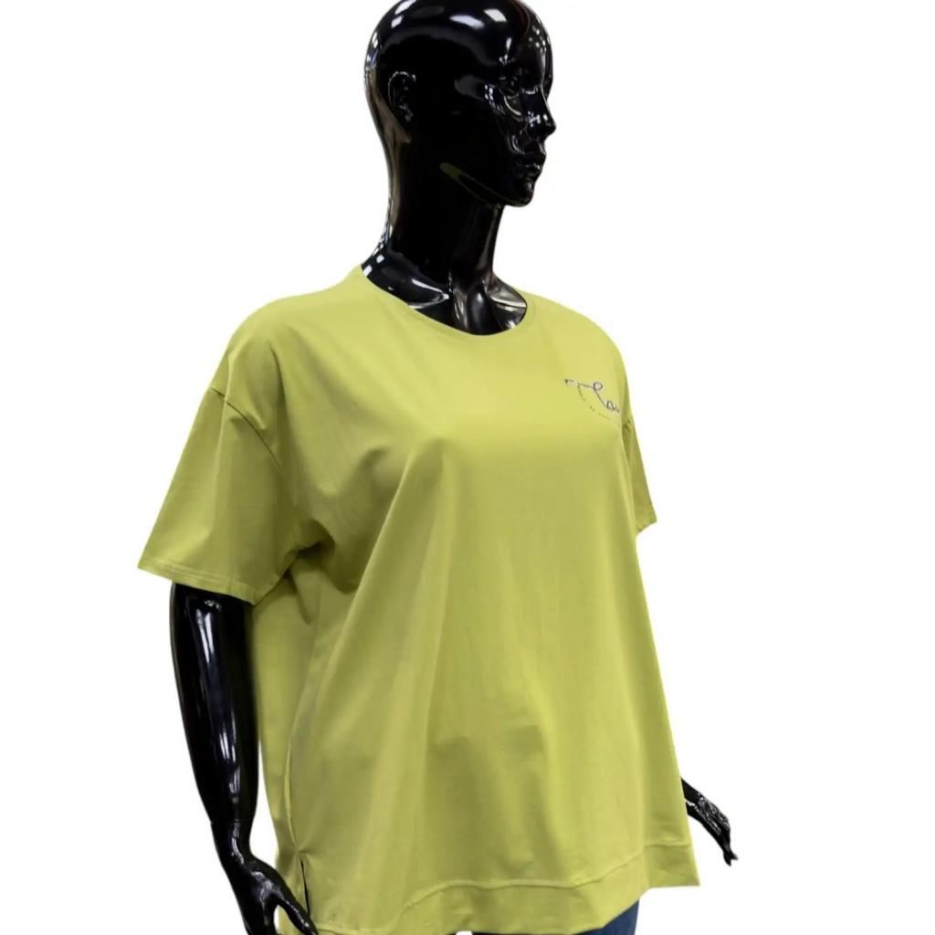 Футболка салатового цвета и прямого силуэта идеально подойдет для любителей комфорта. Ее длина чуть ниже сгиба бедра позволяет сочетать ее с различными брюками и джинсами, а круглый вырез горловины обеспечивает удобную посадку. Втачной короткий рукав добавляет нотку изящества. Слева на груди элегантная надпись расположенная полукругом подчеркивает романтический характер футболки. Разрезы снизу в боковых швах делают образ более интересным и обеспечивают идеальную посадку по фигуре.