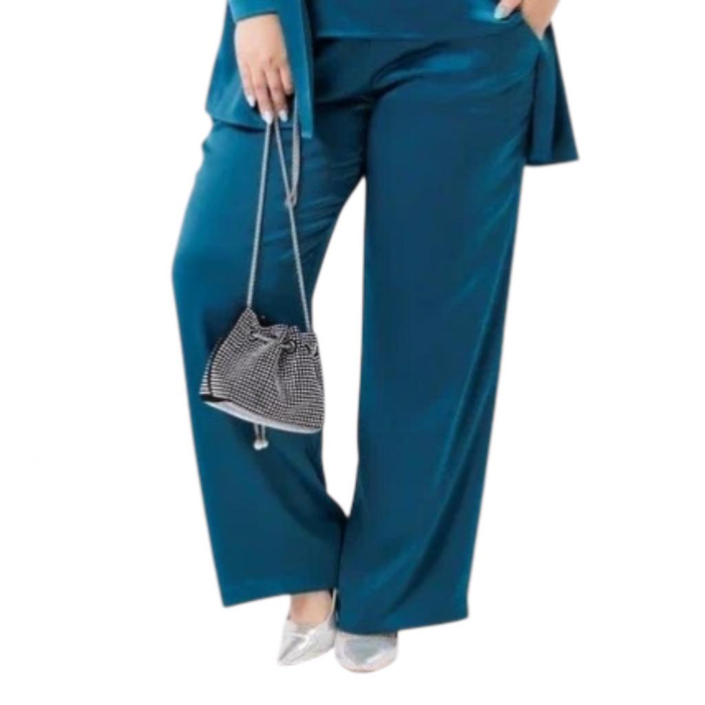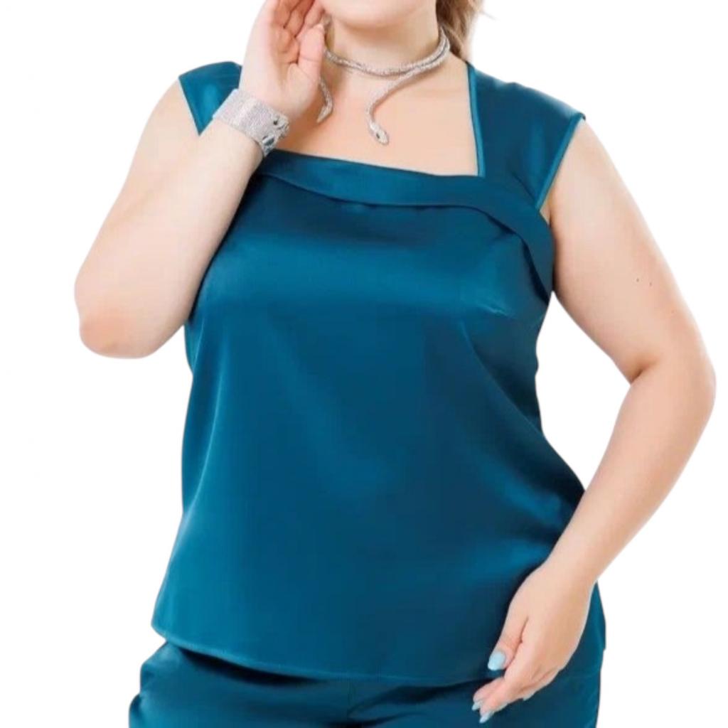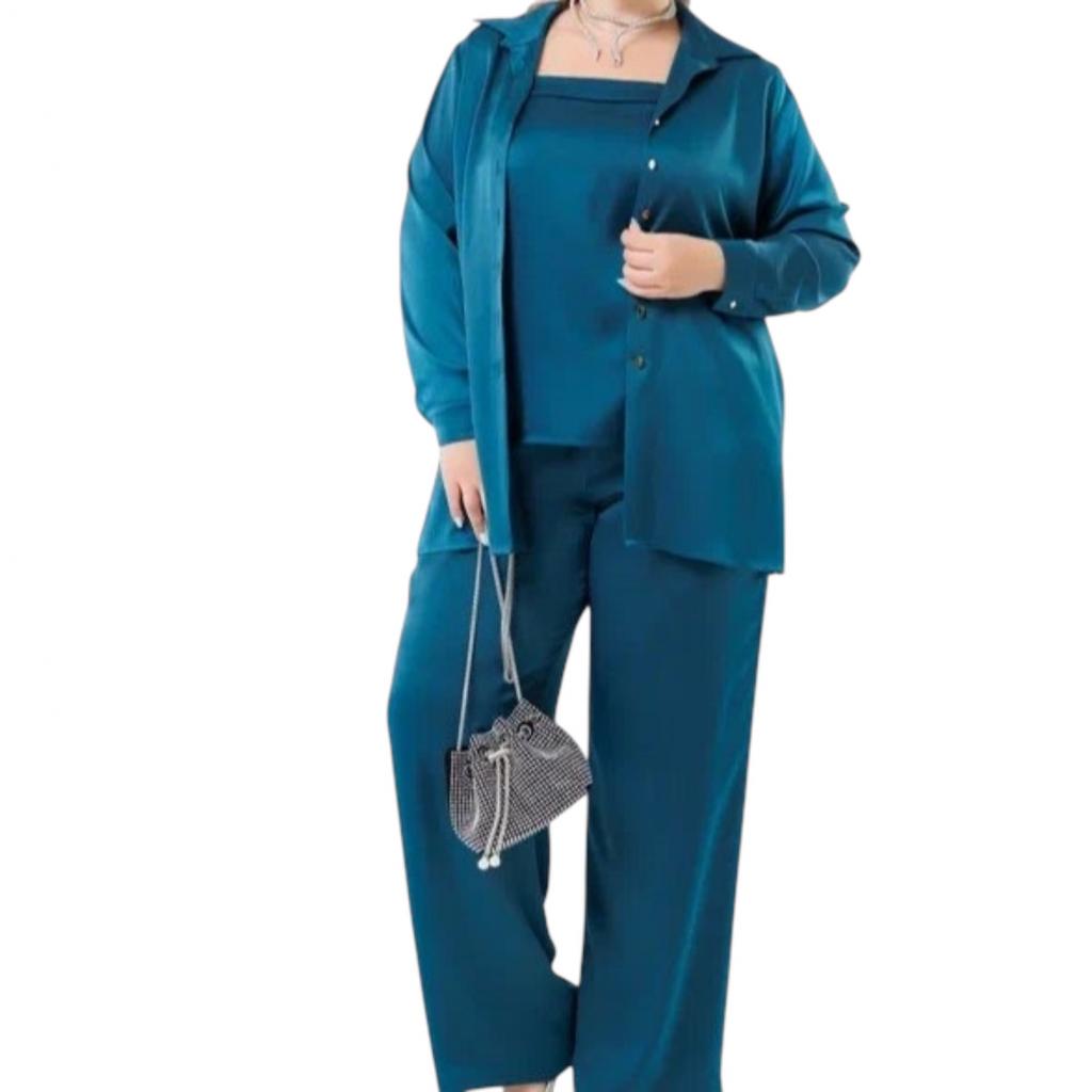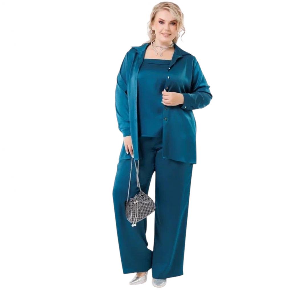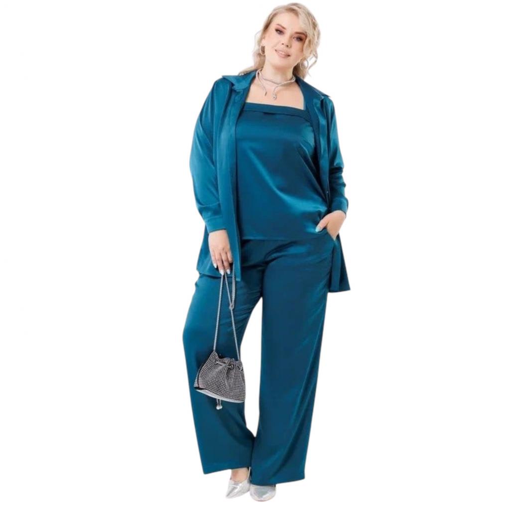 Комплект ( рубашка + топ + брюки ) выполнен из атласа. Рубашка свободного силуэта. Отложной воротник. Рукав втачной, длинный, на манжете. По центру застёжка на пуговицы. В 6оковых швах, внизу, разрезы.