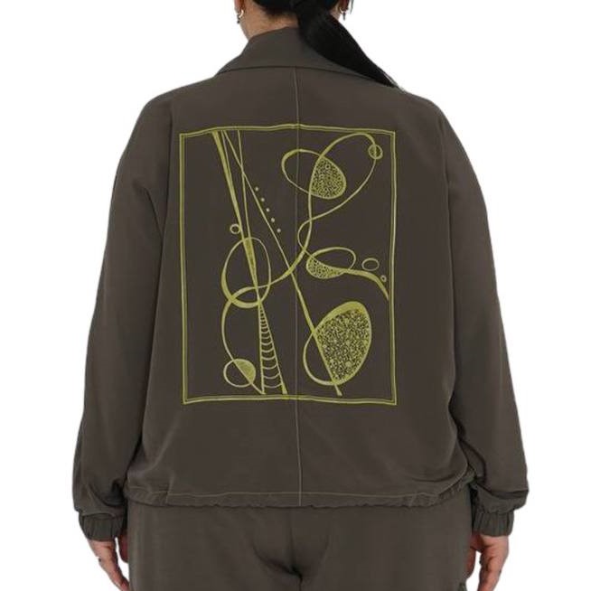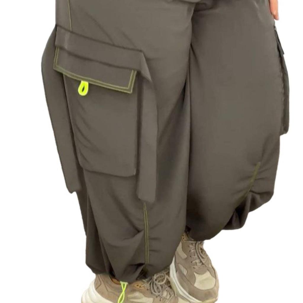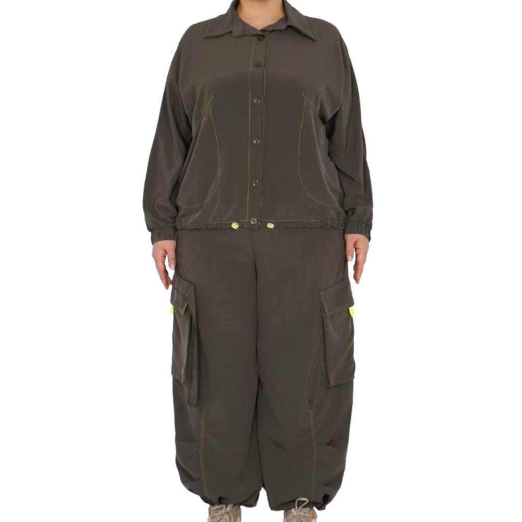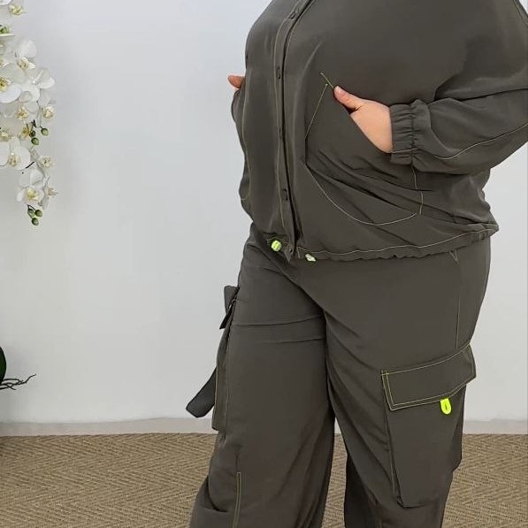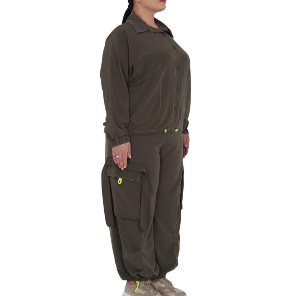 Женский костюм в стиле милитари состоит из жакета и брюк, выполненных из ткани цвета хаки с контрастной салатовой отстрочкой. Жакет имеет свободный крой длиной до сгиба бедра, воротник- отлетной на стойке. Застежка на пуговицы. На груди расположены два функциональных кармана с декоративными строчками. Рукава полной длины с манжетами на резинке. На спине абстрактный принт салатового цвета. Брюки типа “карго” имеют два накладных кармана на бедрах и два боковых кармана. Пояс на резинке для комфортной посадки. Низ брючин также на резинке для защиты от грязи и воды. Ткань костюма состоит из 50% вискозы и 50% полиэстера, что обеспечивает легкость, быстрое высыхание, долговечность и простоту ухода. Этот костюм идеально подойдет для активного отдыха, путешествий или повседневной носки.
