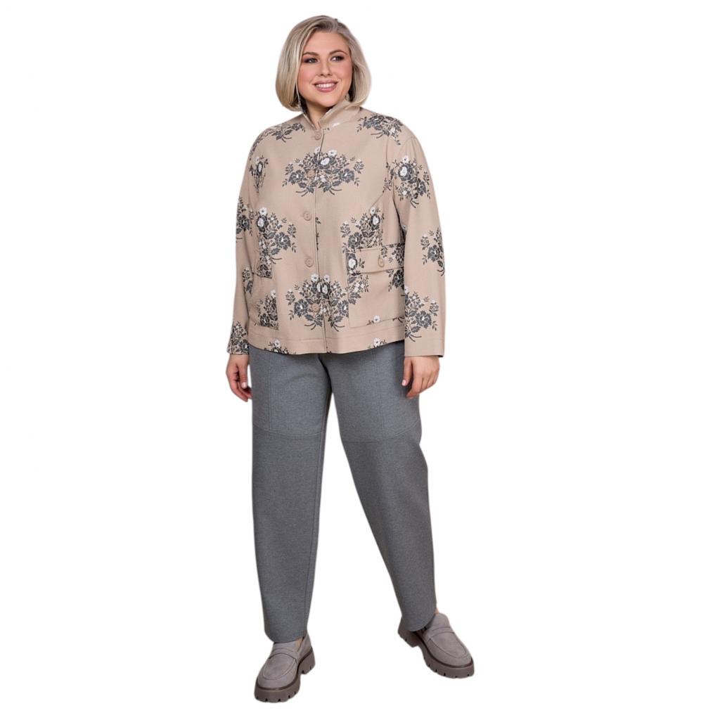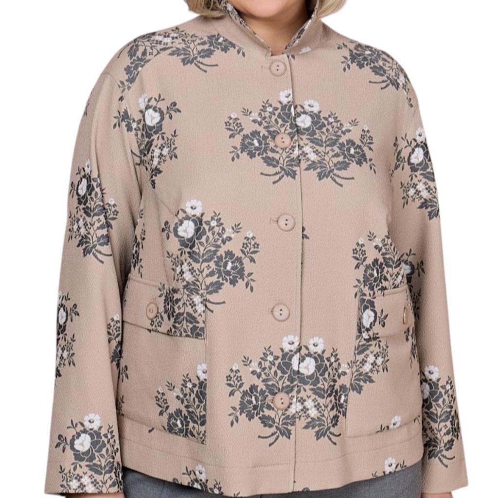 Изысканная классика воплотилась в этом великолепном жакете, который станет истинным украшением вашего гардероба. Благородный бежевый оттенок и утонченный цветочный принт в серых тонах создают неповторимый образ, подходящий как для деловых встреч, так и для светских мероприятий.