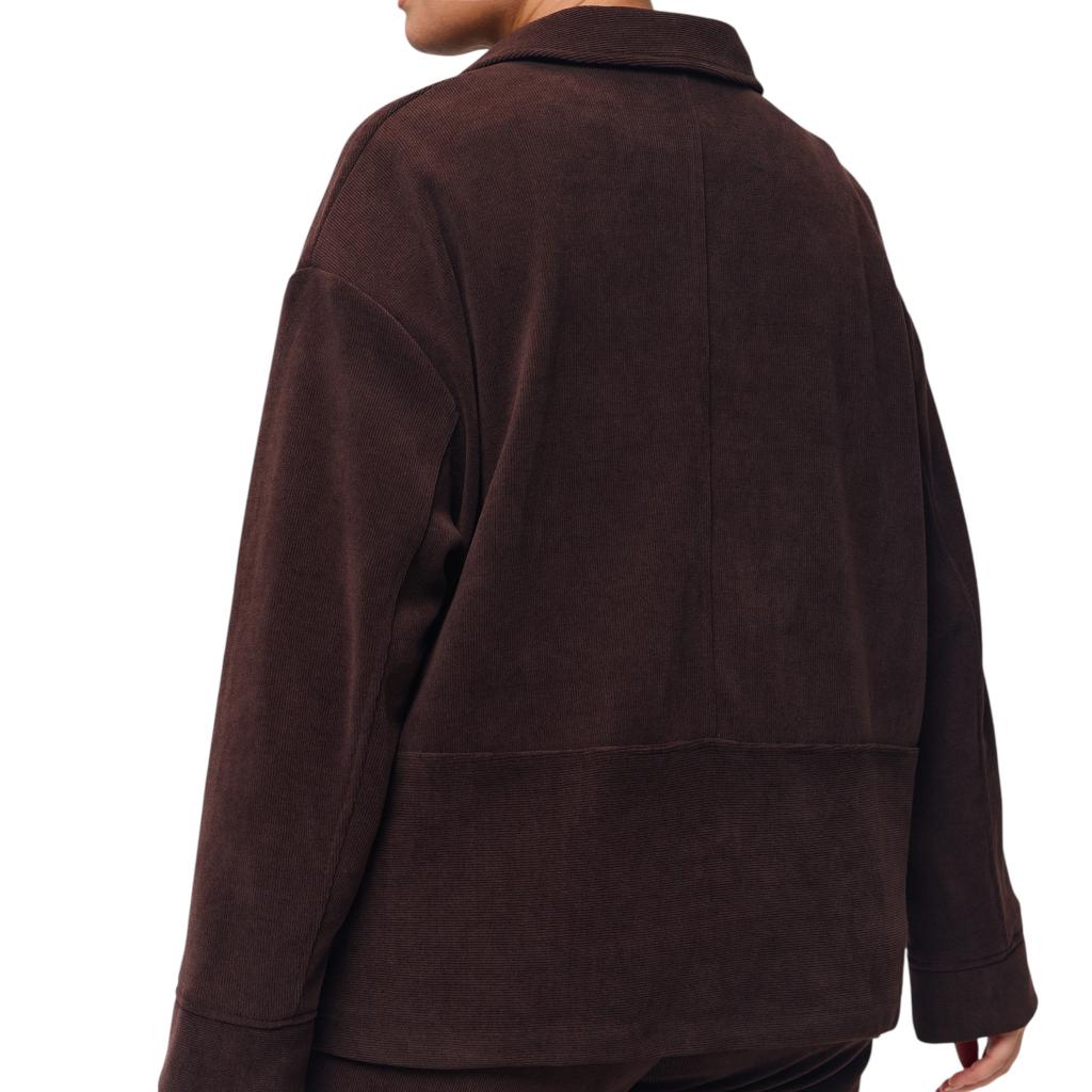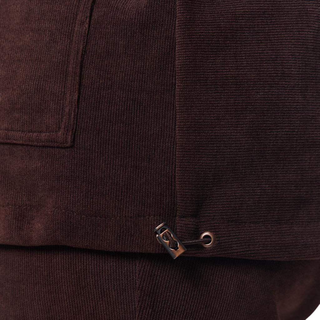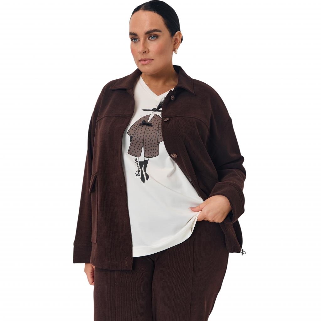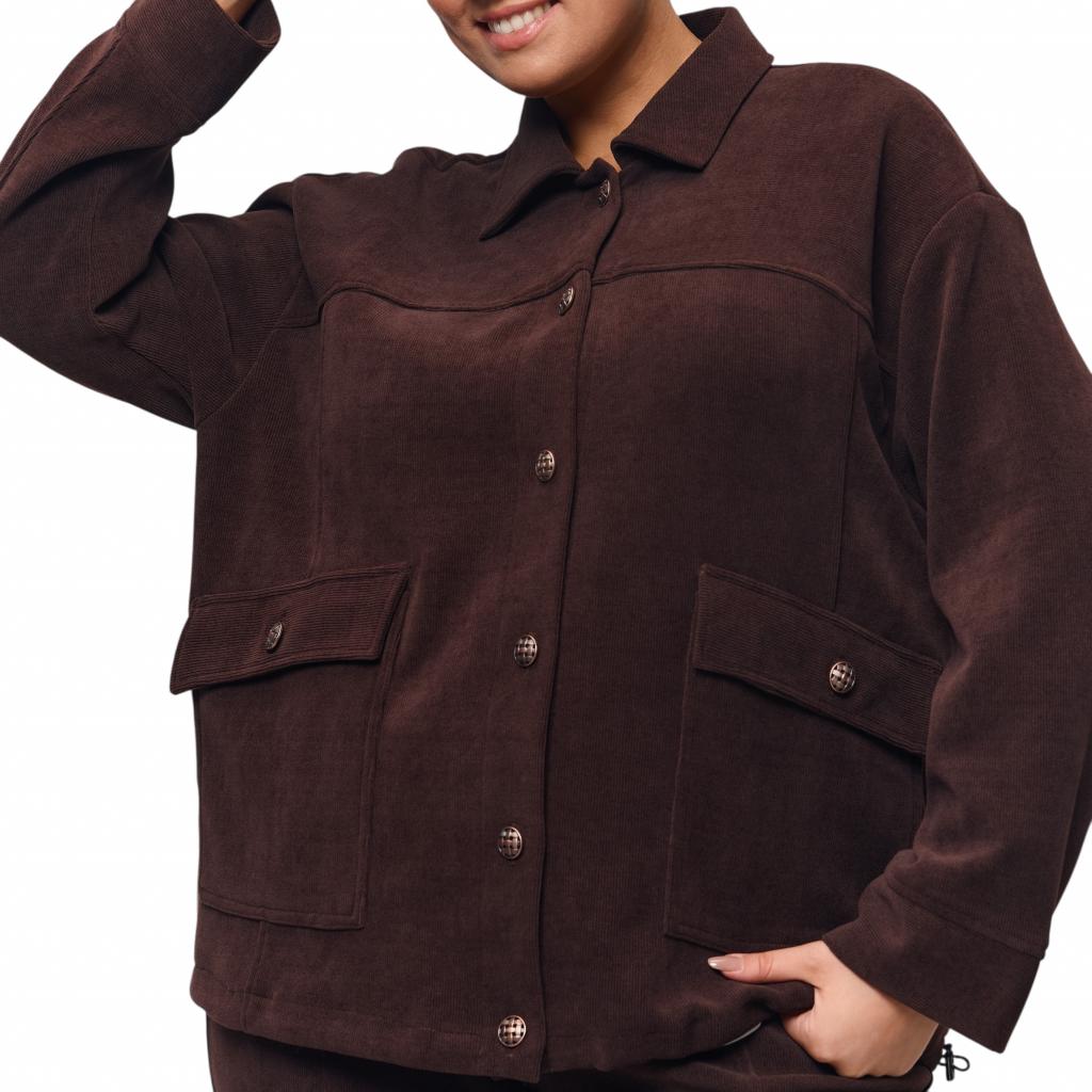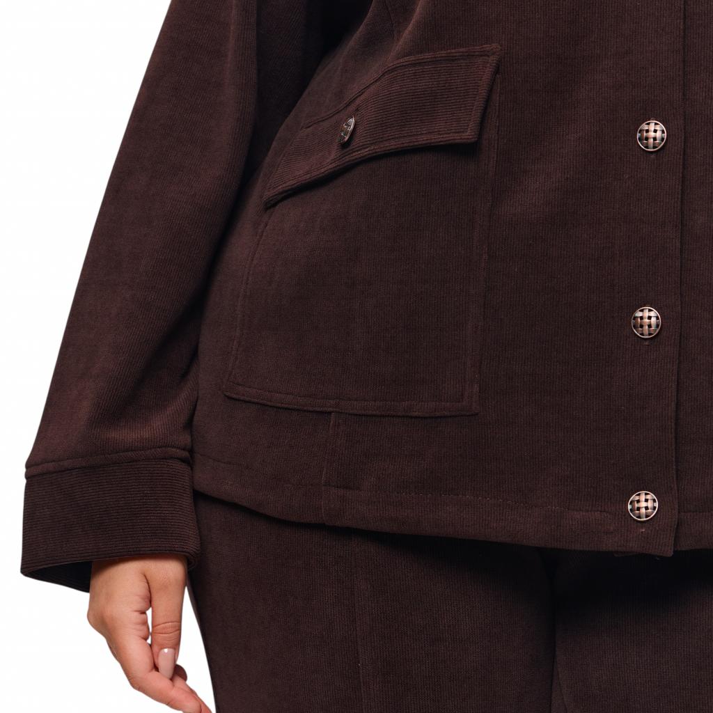 Женский жакет шоколадного цвета из микровельвета на трикотажной основе станет прекрасным выбором для создания стильного и комфортного образа. Шоколадный цвет придаёт жакету вайб оригинальности, а отлетной воротник и застежка на пуговицы обеспечивают удобство и тепло. Костюм выполнен из очень нежной и приятной для тела ткани, которая обеспечивает комфорт, ощущение уюта и хорошо садится по фигуре. Особенностью жакета являются большие накладные карманы с клапанами, которые добавляют изюминку и функциональность образу.