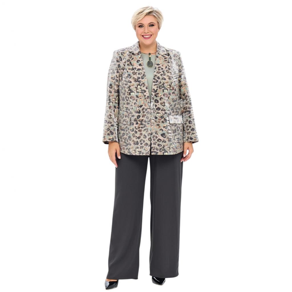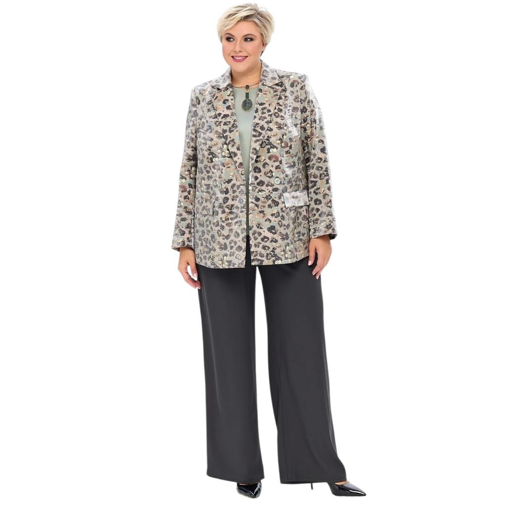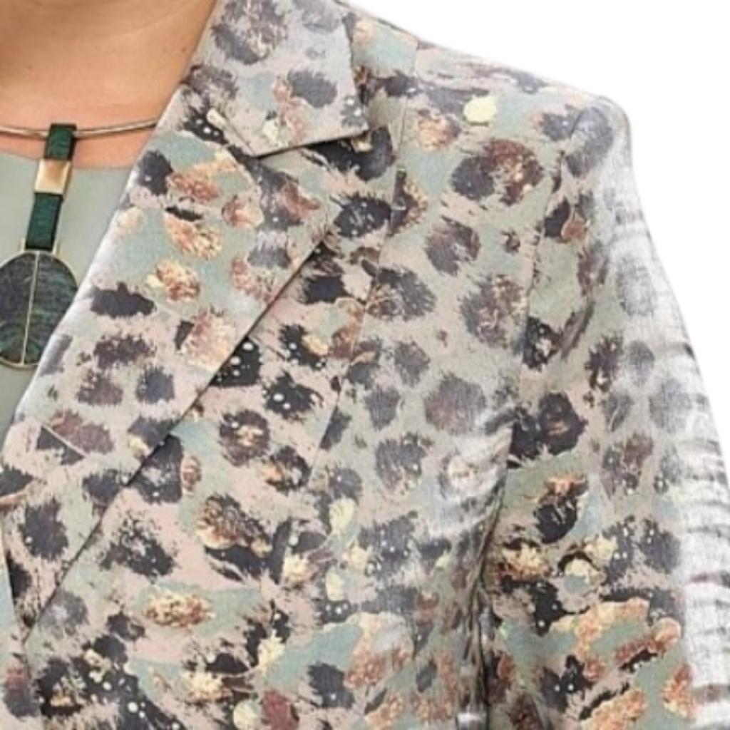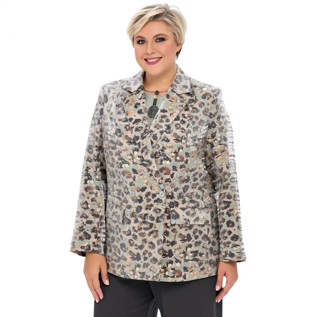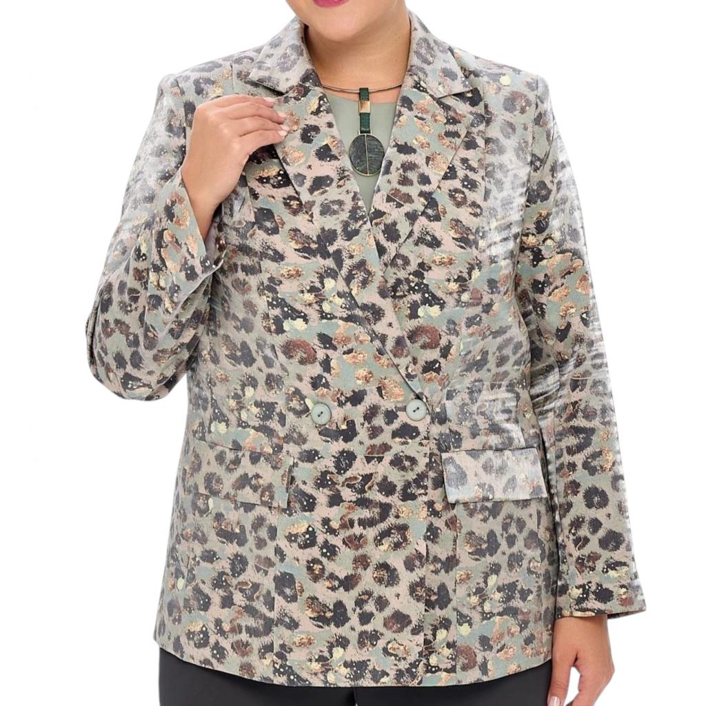 Классический двубортный пиджак преображен благодаря инновационной ткани с эффектом голограммы, которая создает завораживающее переливающееся сияние при любом освещении. Дизайн модели сочетает в себе элегантность и дерзость. Фисташковый фон с леопардовым принтом придает образу особую выразительность, а голографический эффект ткани делает пиджак настоящим произведением искусства.