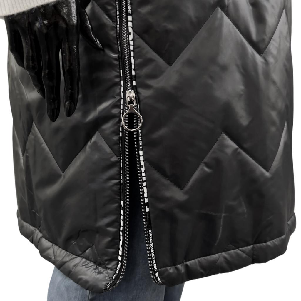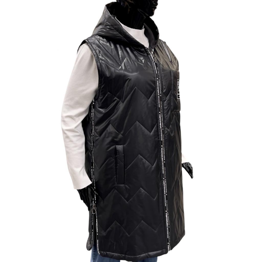 Этот стеганный жилет создан специально для теплой осенней погоды. Утеплитель из тонкого слоя синтепона гарантирует комфорт даже при низких температурах. Прямой силуэт и разрезы внизу в боковых швах на молниях позволяет носить его с различными видами одежды, от джинсов до юбок. Длина чуть ниже колена делает жилет универсальным для женщин разного роста и комплекции.