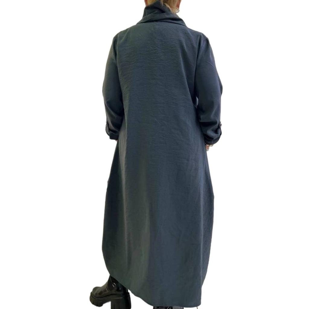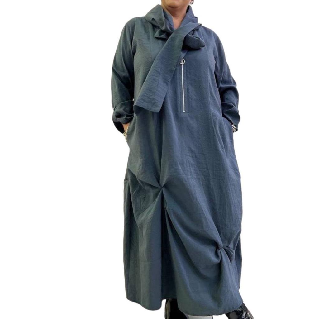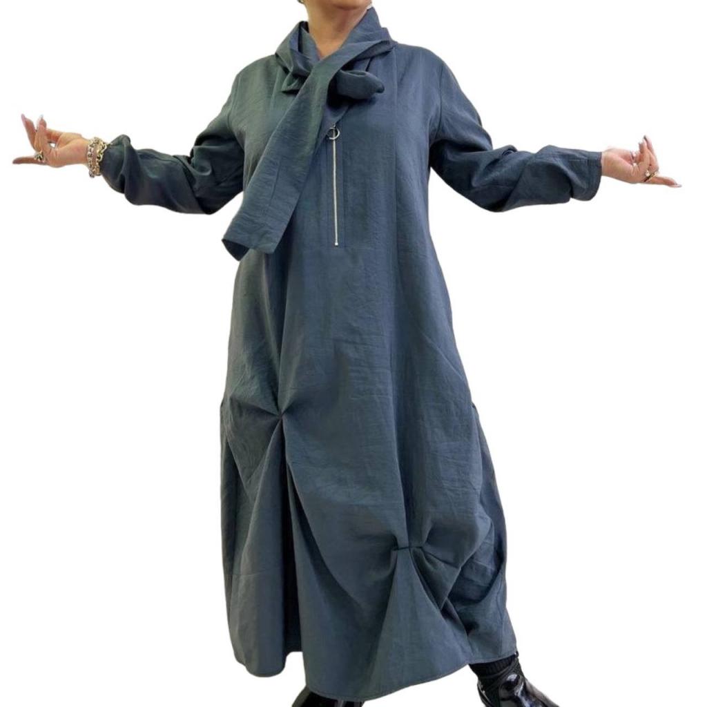 Моднейшее платье в пол цвета мокрого асфальта имеет V-образный вырез горловины, застёжку-молнию на груди, длинные рукава и симпатичные крупные сборки на полочке. В комплекте прилагается шарф, завязывая который разными способами получаем эффектный декор.