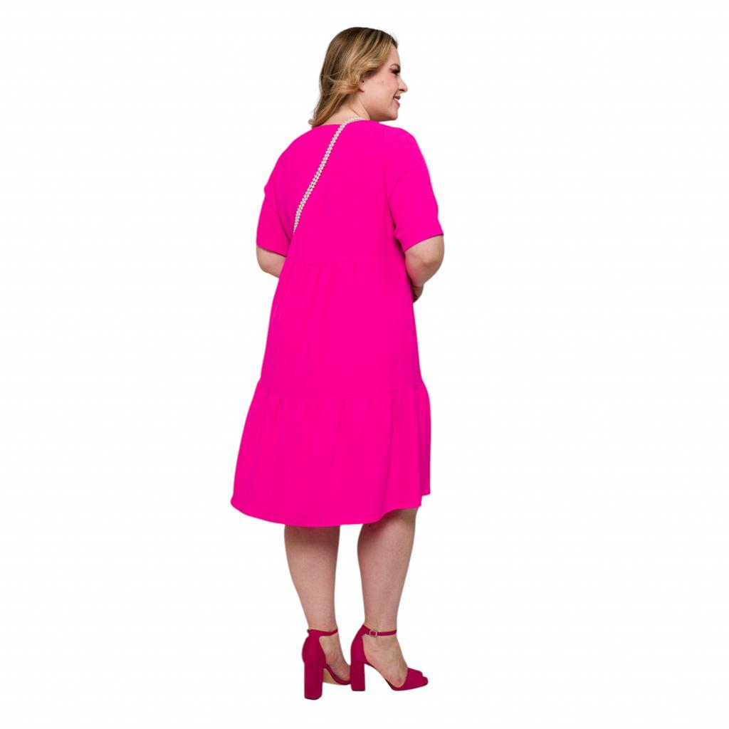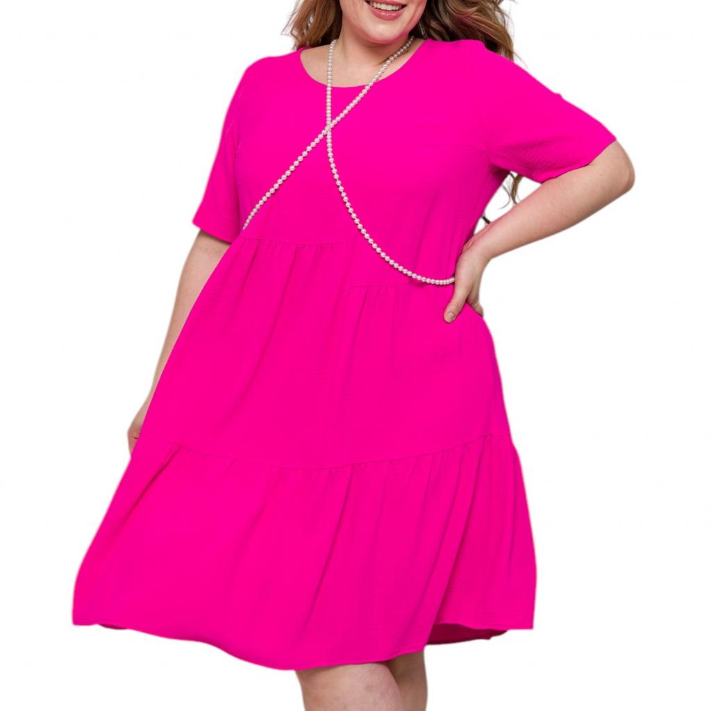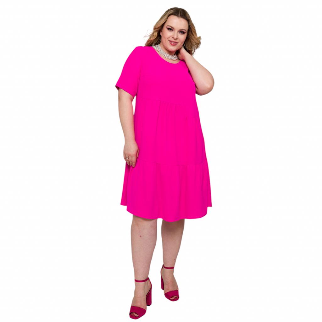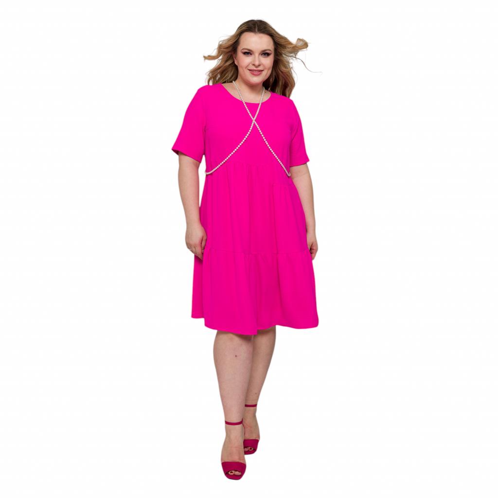 Яркое летнее платье в сочном оттенке фуксии станет настоящей звездой вашего гардероба! Элегантная модель с А-образным силуэтом идеально подчеркнет вашу женственность, а длина чуть ниже колена сделает образ утонченным и универсальным.
