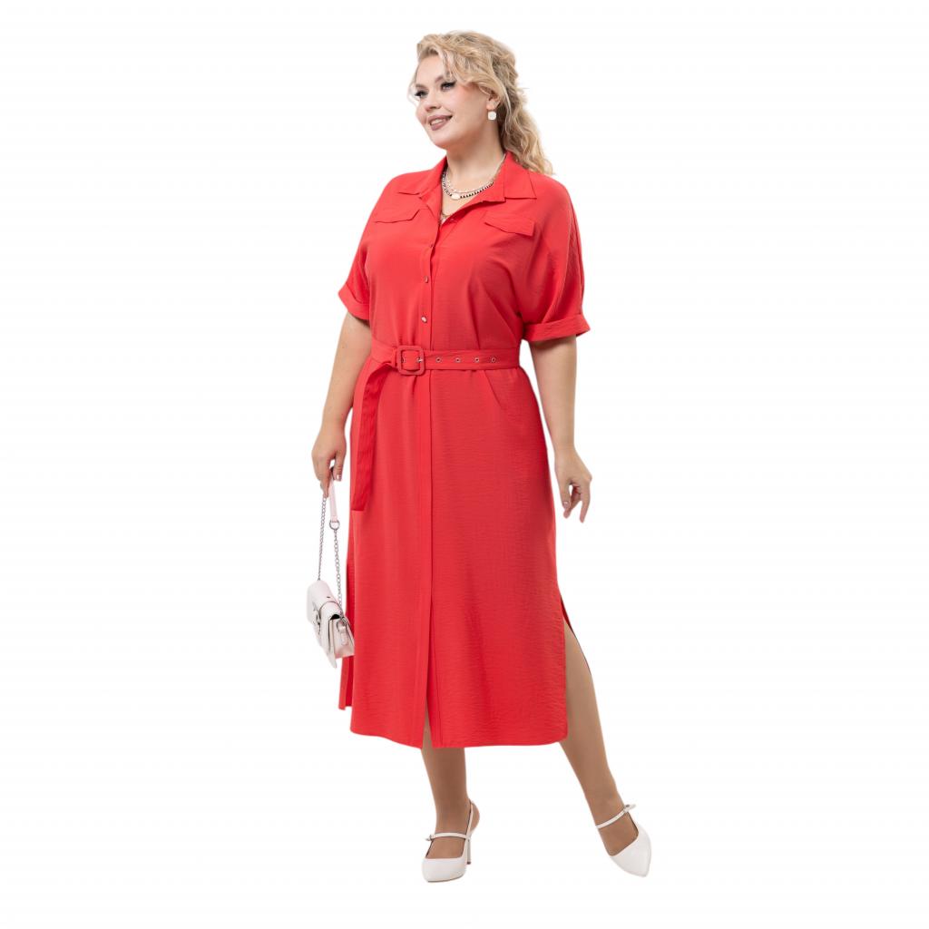 Модель прямого силуэта выполнена из ткани « Каролина» с эффектом крэш. Отложной воротник. Спущенная линия плеча. Рукав короткий, на манжете. По полочке « клапаны» в верху изделия и по центру застёжка на пуговицы. В боковых швах разрезы и действующие карманы. К изделию прилагается съёмный пояс. По спинке средний шов.